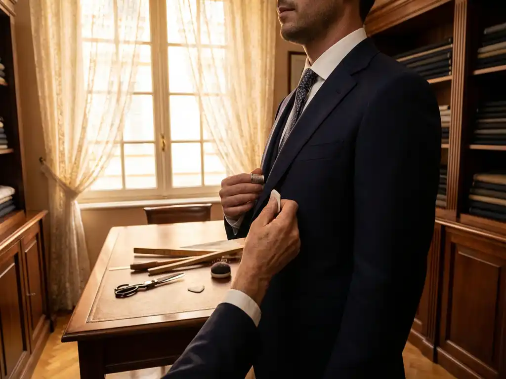Het maatproces begint altijd met een uitgebreid consult waarbij alle belangrijke maten worden opgenomen. Denk aan borstomvang, taillewijdte, schouderbreedte en armlengte. Ook details zoals de stand van je schouders en je houding spelen een belangrijke rol in hoe het kostuum uiteindelijk valt.