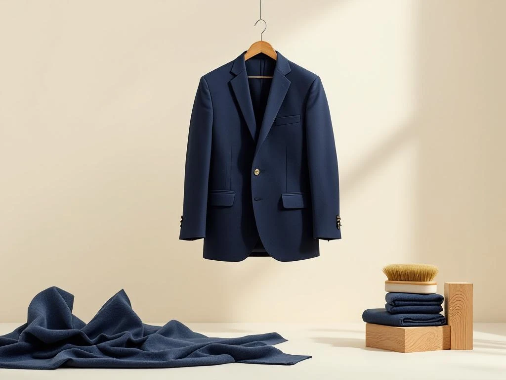 Navy suit jacket hanging mid-air with wooden hanger, garment brush, and cedar blocks arranged symmetrically on cream background
