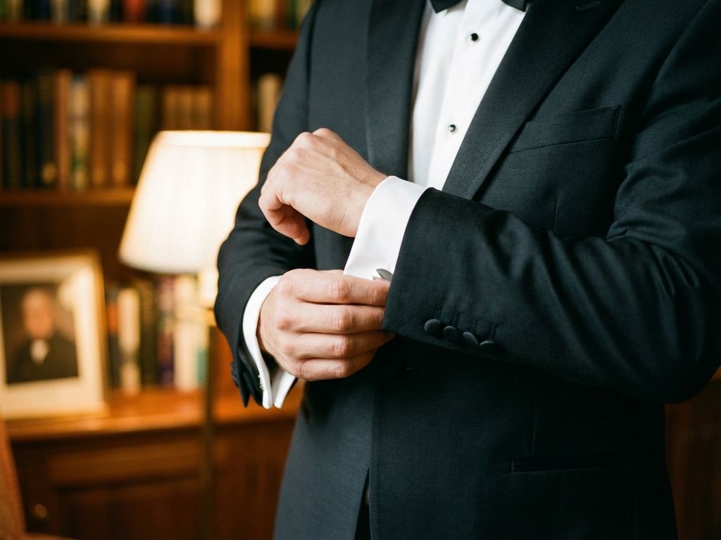 Homme en smoking noir ajustant d'élégants boutons de manchette, mettant en valeur le style formel de la mode masculine et les détails raffinés du style.