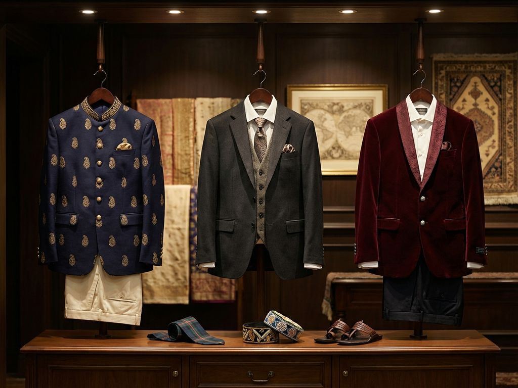 Les coupes et les styles traditionnels offrent des moyens structurels d'honorer l'héritage. Pensez aux vestes à col Nehru pour l'influence indienne, aux cols mandarins pour l'héritage chinois, ou aux silhouettes traditionnelles modifiées qui mélangent des éléments culturels avec des coupes contemporaines. Ces approches permettent de créer des costumes de mariage uniques qui racontent votre histoire.