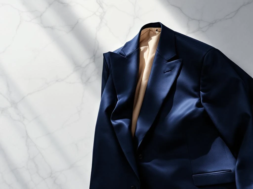 Veste de costume marine pliée en motif géométrique sur une surface en marbre blanc avec éclairage doux et détails de la doublure beige