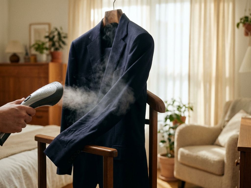 Investeer in brede kledinghangers die de schouders van je jasje ondersteunen en broekhangers met clips. Een stoomhandschoen beschermt je hand bij handheld gebruik. Budgetvriendelijke alternatieven zijn het ophangen van je pak in een stomende badkamer of het gebruik van een kledingstomer-opzetstuk op je strijkijzer.