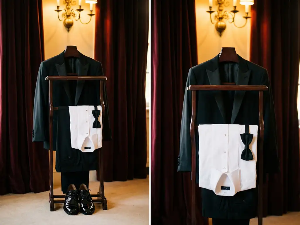 De smokingjas kan zowel een enkele als een dubbele knoopsluiting hebben; beide stijlen zijn even acceptabel. Het witte overhemd moet specifiek een smokingoverhemd zijn met een gladde voorkant of subtiele plissés, en altijd met een omgeslagen kraag. De vlinderdas moet altijd zwart zijn en bij voorkeur van zijde.