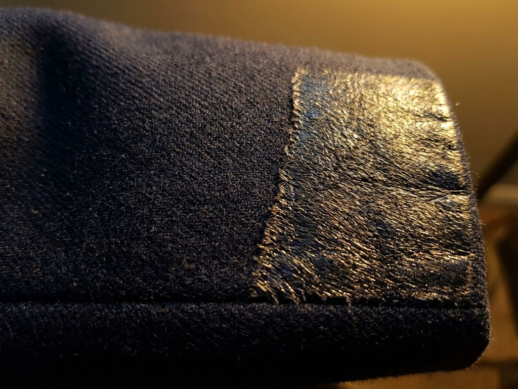 Manchette de manche de costume en laine bleu marine montrant le contraste entre le tissu mat d'origine et la zone usée brillante avec des fibres comprimées.