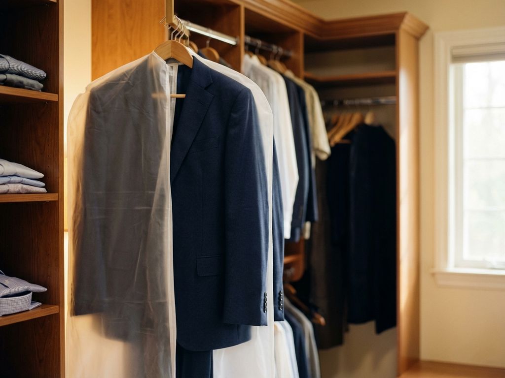 Les poches de protection mogen nooit direct in een kledingzak, omdat dit schimmel, verkleuring en permanente geurbeschadiging kan veroorzaken. Wacht altijd tot het kostuum volledig droog is voordat je het opbergt in een afgesloten omgeving.