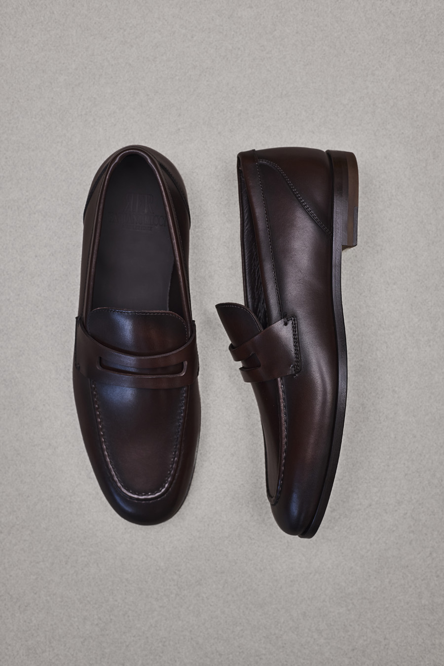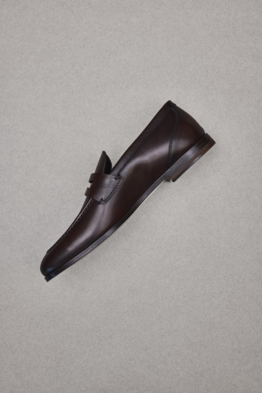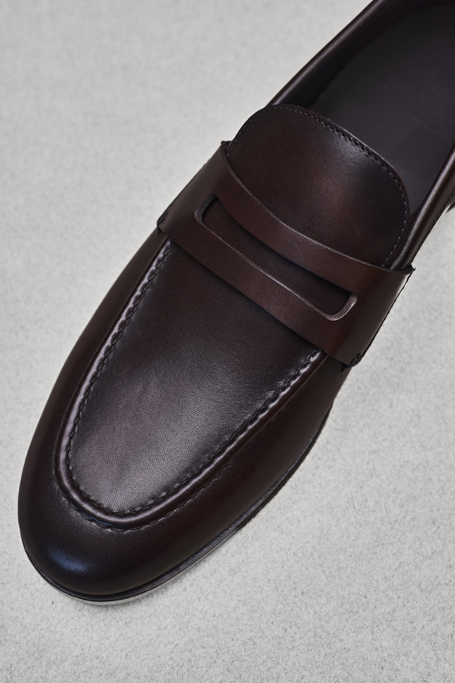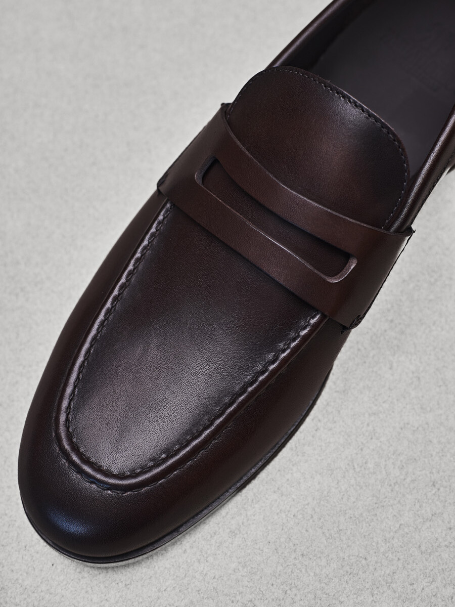Sophistication meets everyday wear in these brown leather loafers. Made from premium textured grain leather, they feature a traditional penny loafer design with refined stitching and a comfortable slip-on silhouette. The deep brown hue and subtle sheen add a touch of luxury, making them suitable for both business and leisure.