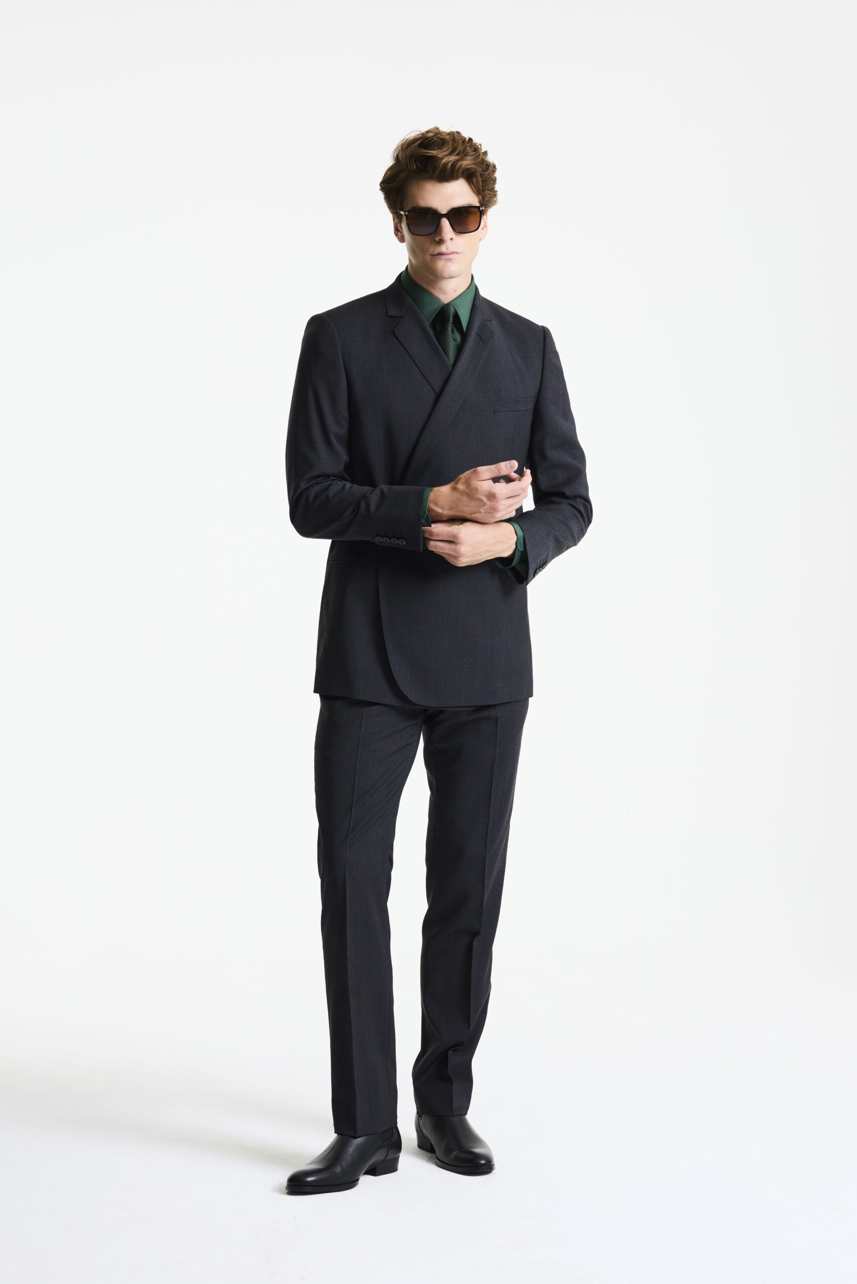Half-canvas suit jacket with a straight shoulder and a modestly tailored fit. Trousers with a narrow, cropped leg.