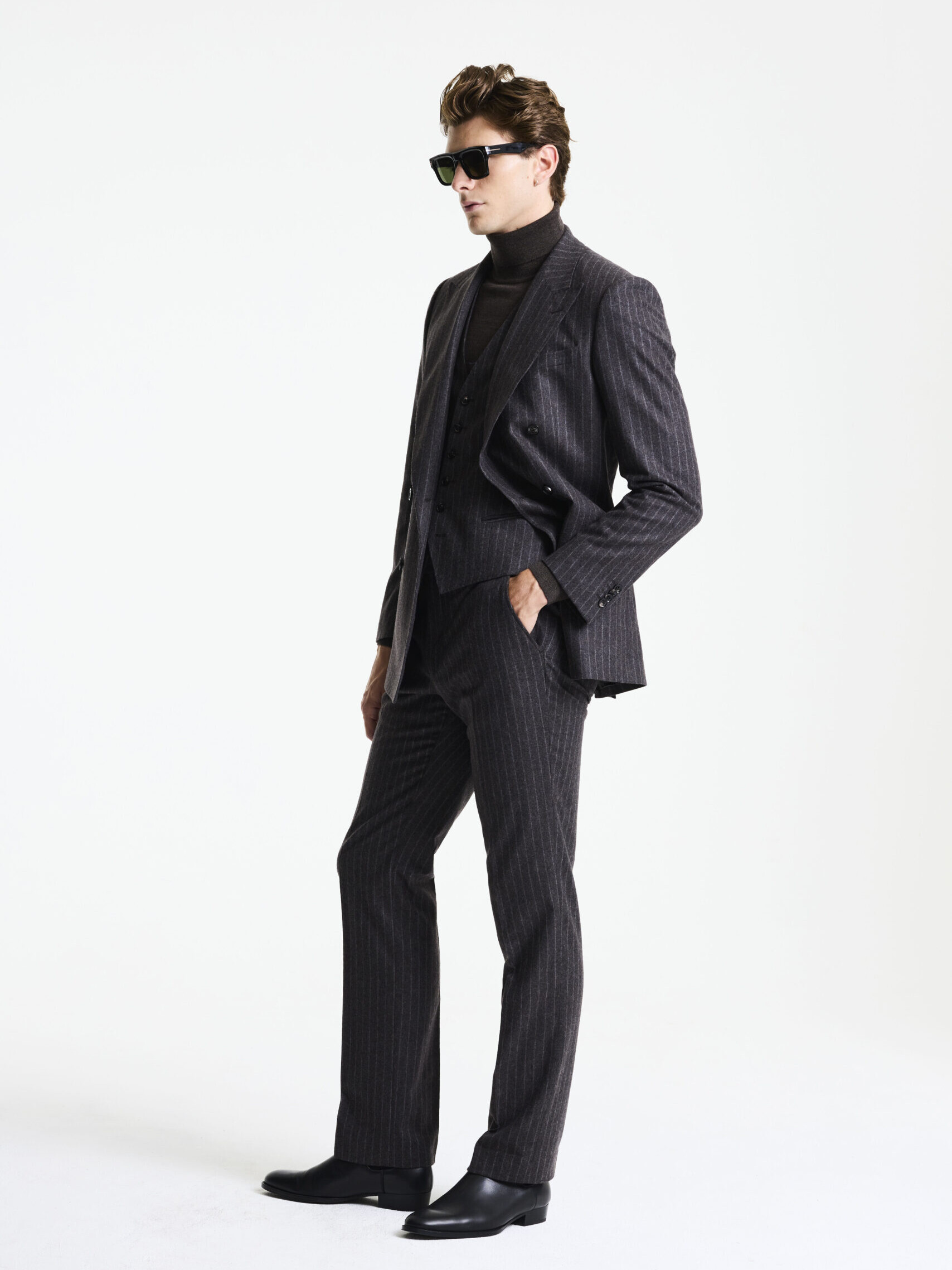 Half-canvas suit with classic smoking-shawl lapels, a straight shoulder, jetted pockets on a single button jacket. Mid-rise trousers with belt loops, zipper-fly, flat front.