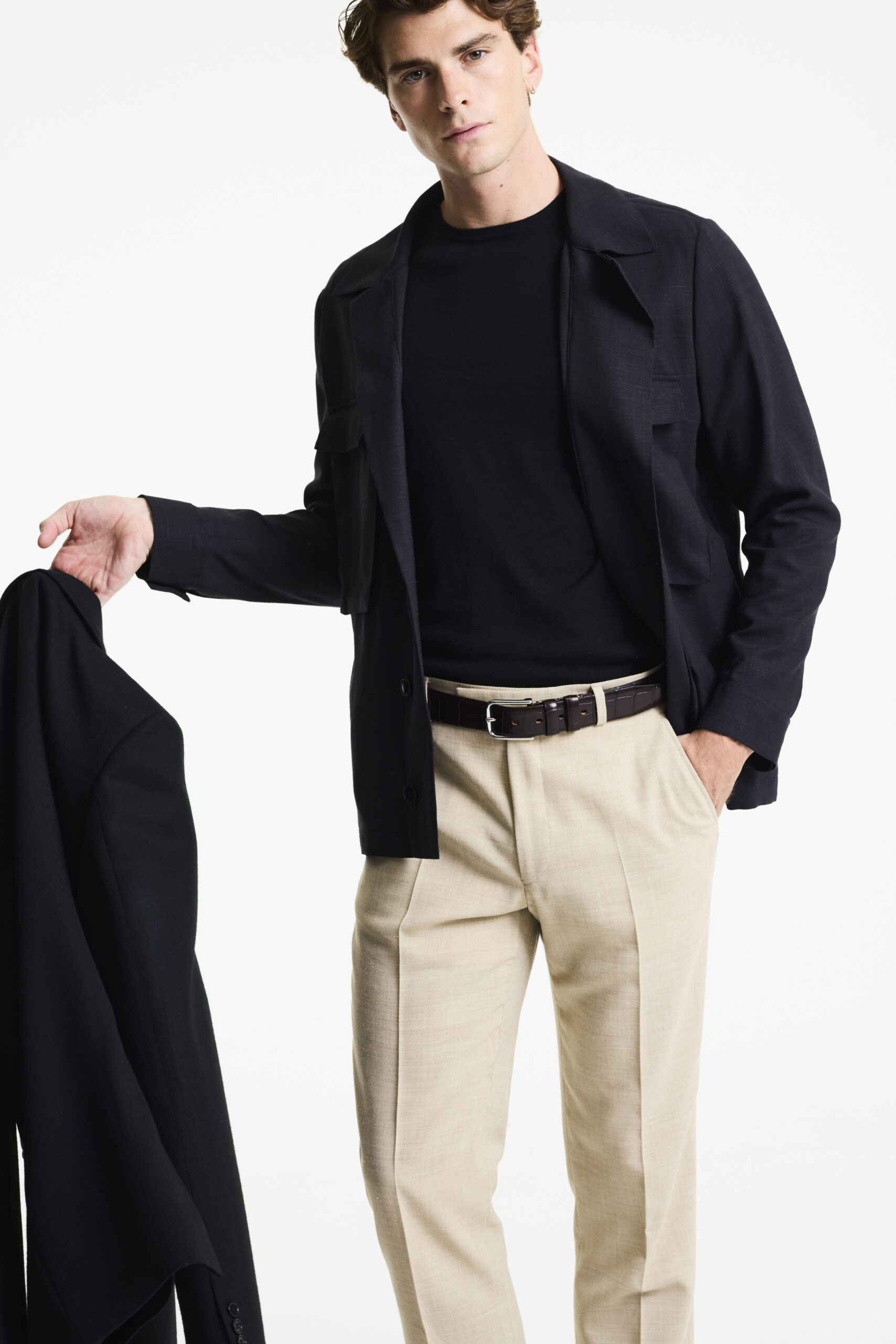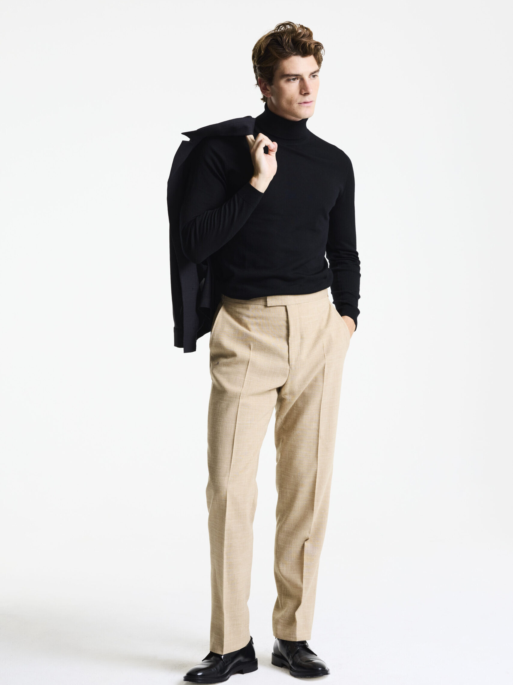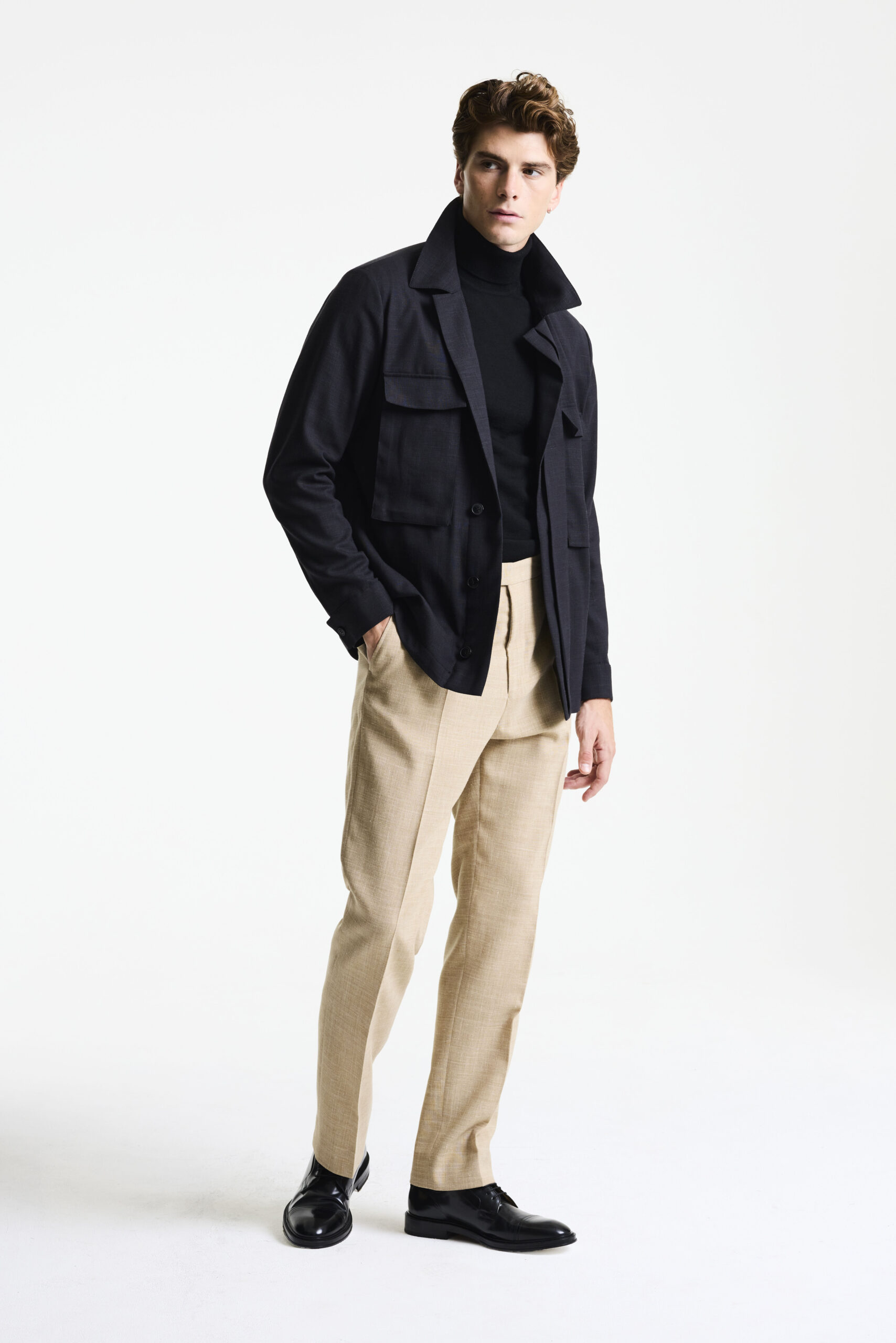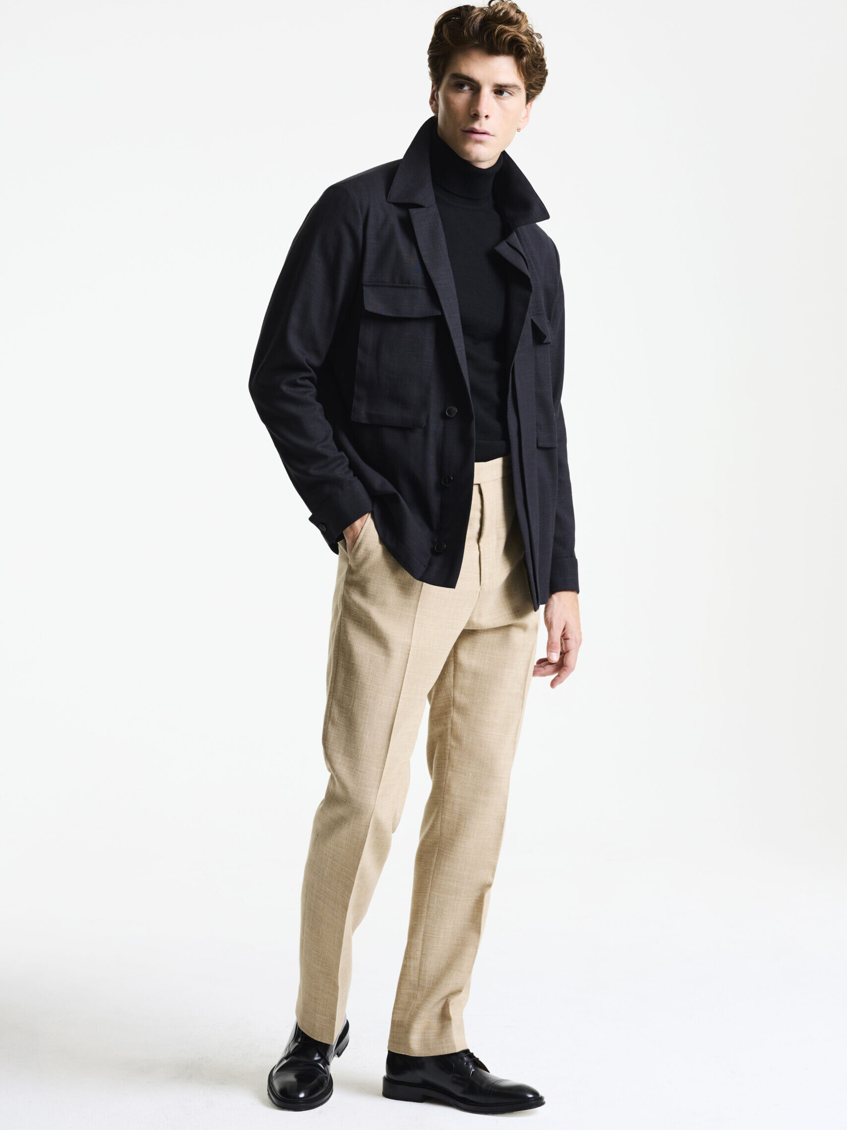 Half-canvas suit jacket with a straight shoulder and a modestly tailored fit. Trousers with a narrow, cropped leg.