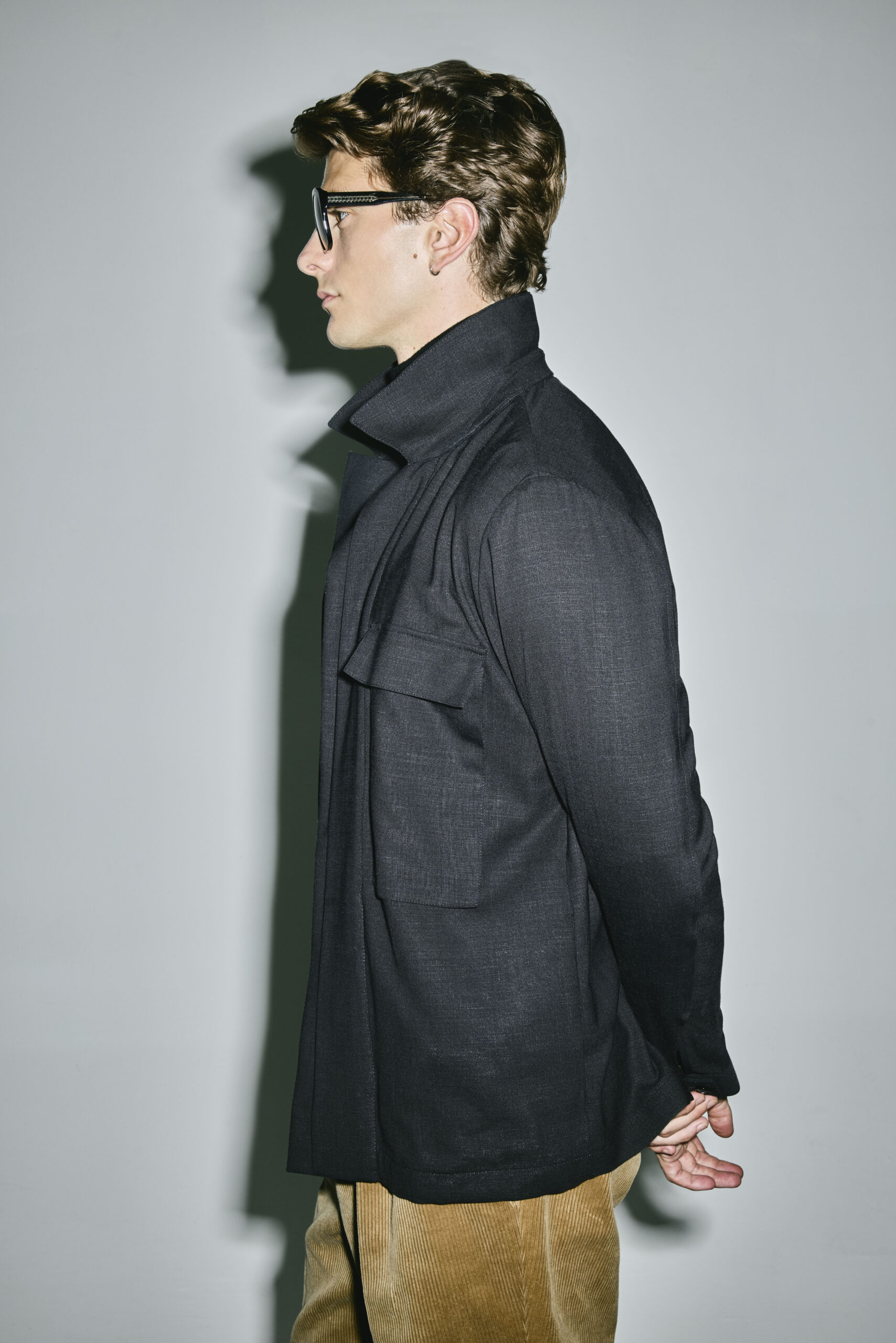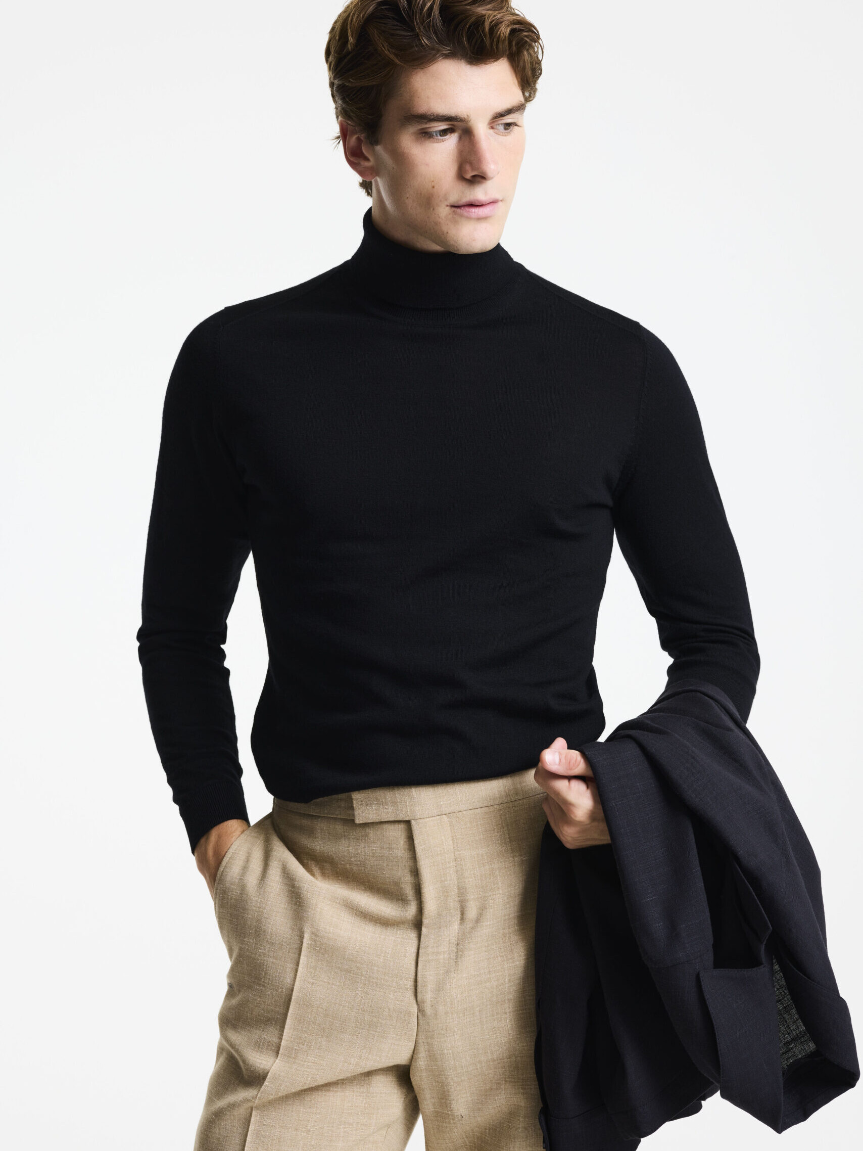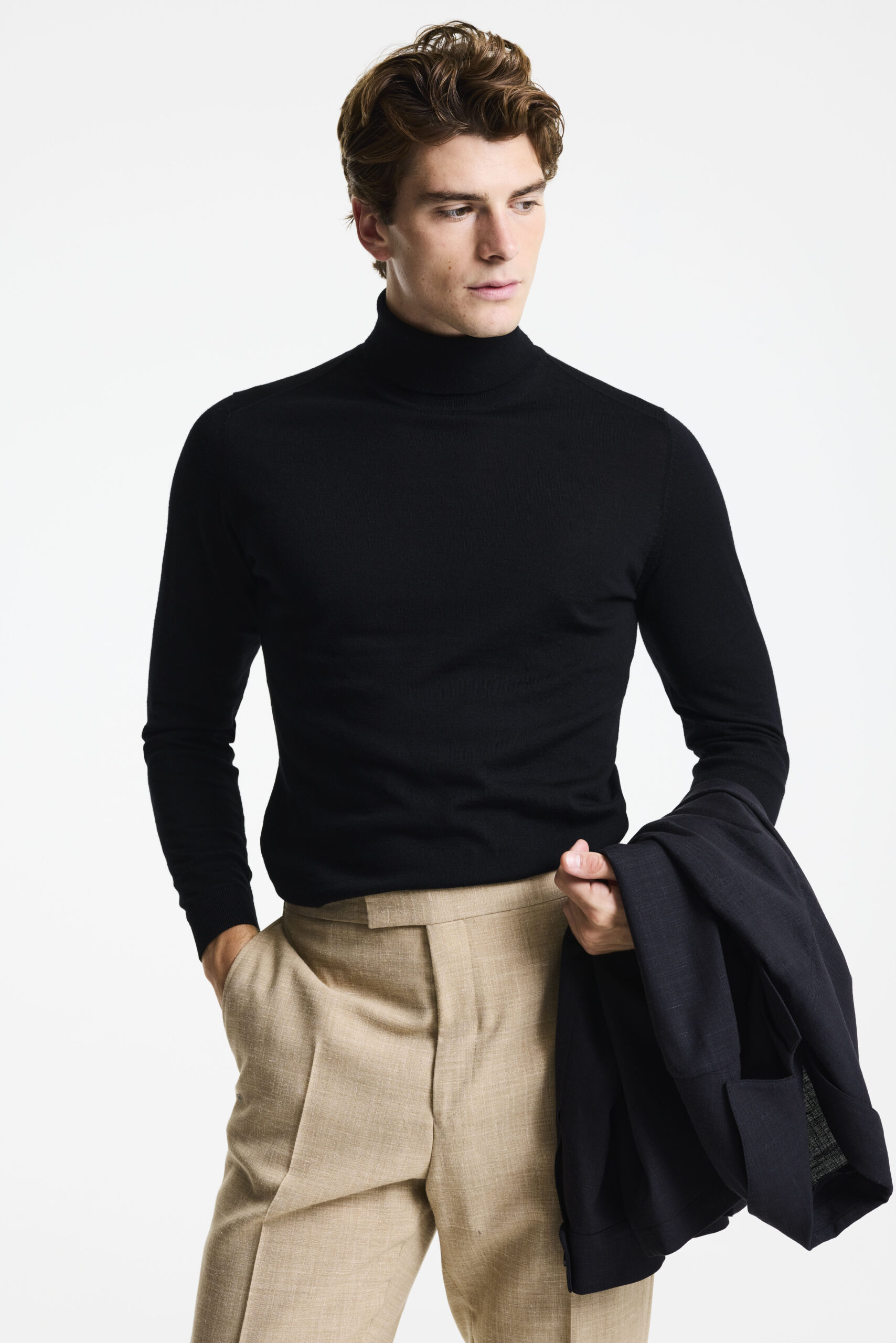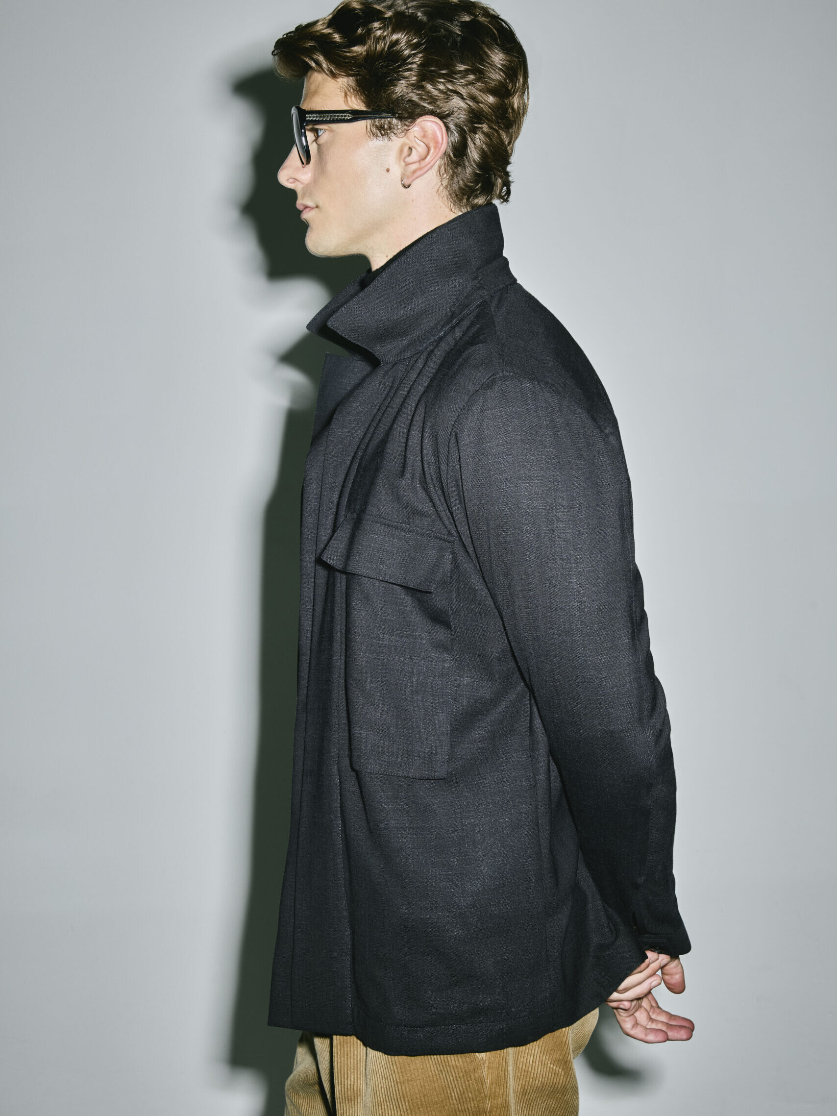 Half-canvas suit jacket with a straight shoulder and a modestly tailored fit. Trousers with a narrow, cropped leg.