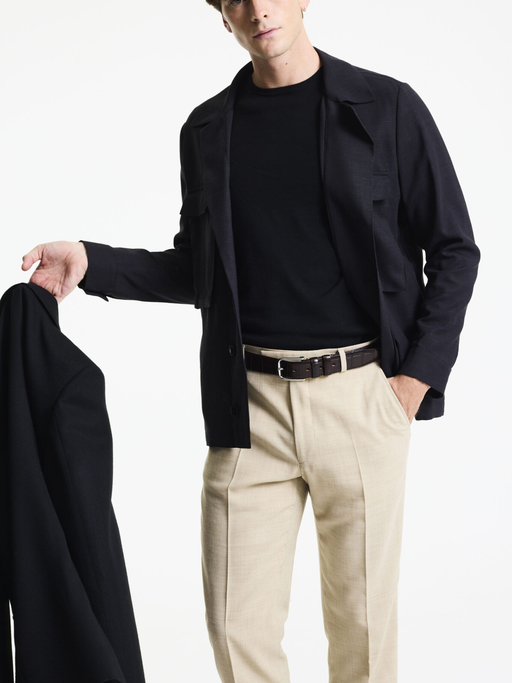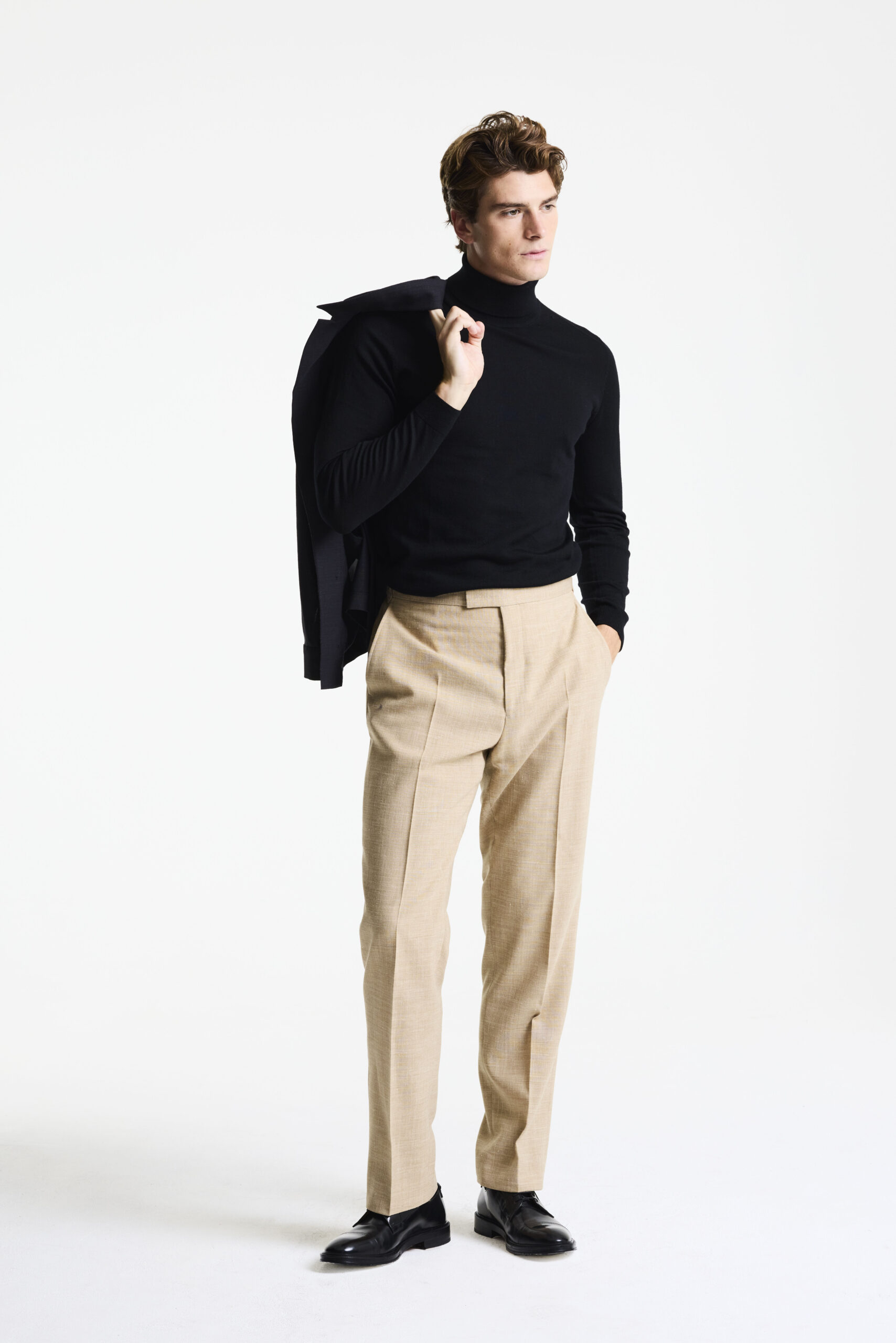 Half-canvas suit with classic smoking-shawl lapels, a straight shoulder, jetted pockets on a single button jacket. Mid-rise trousers with belt loops, zipper-fly, flat front.