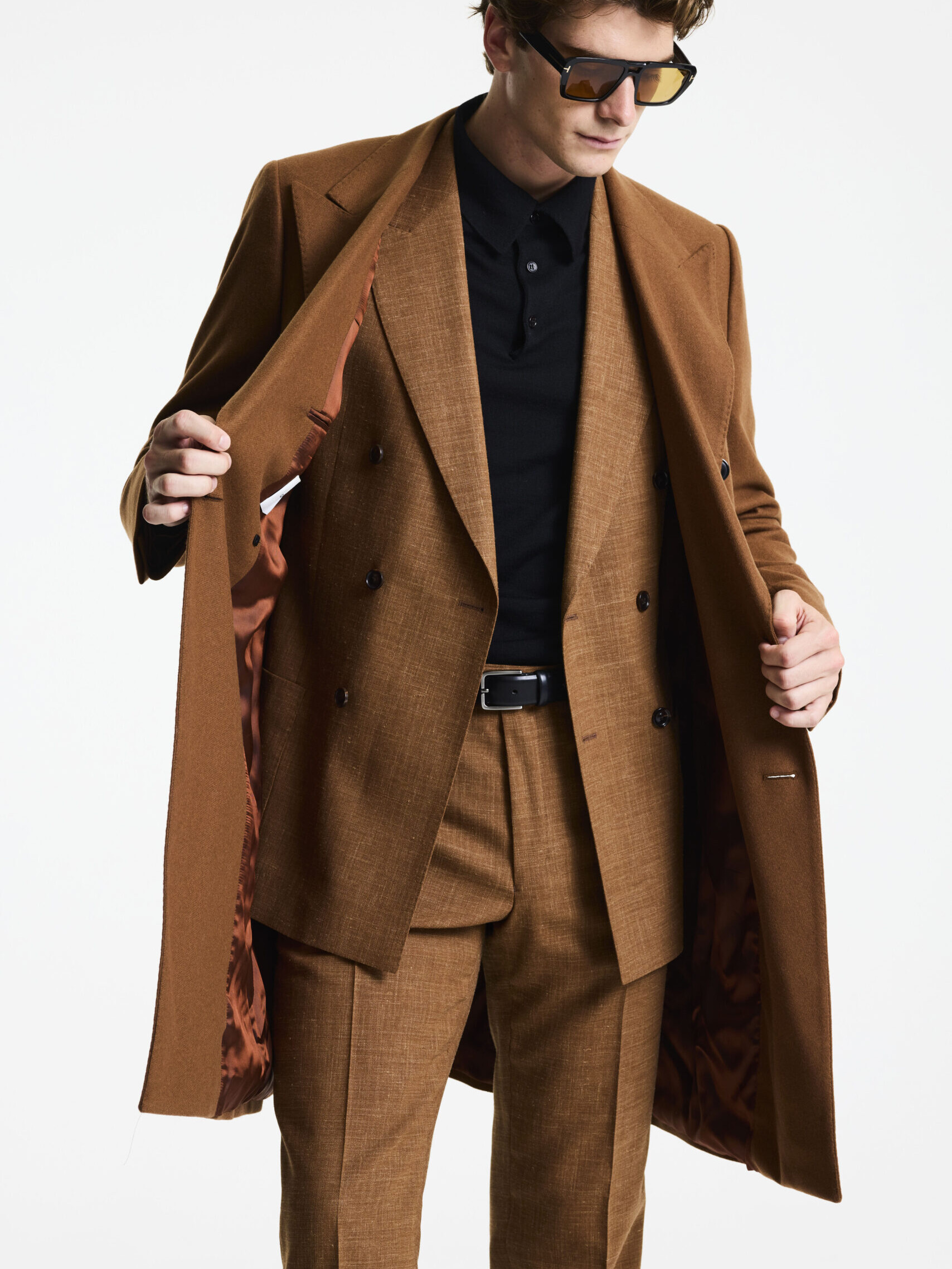 Half-canvas suit with classic smoking-shawl lapels, a straight shoulder, jetted pockets on a single button jacket. Mid-rise trousers with belt loops, zipper-fly, flat front.