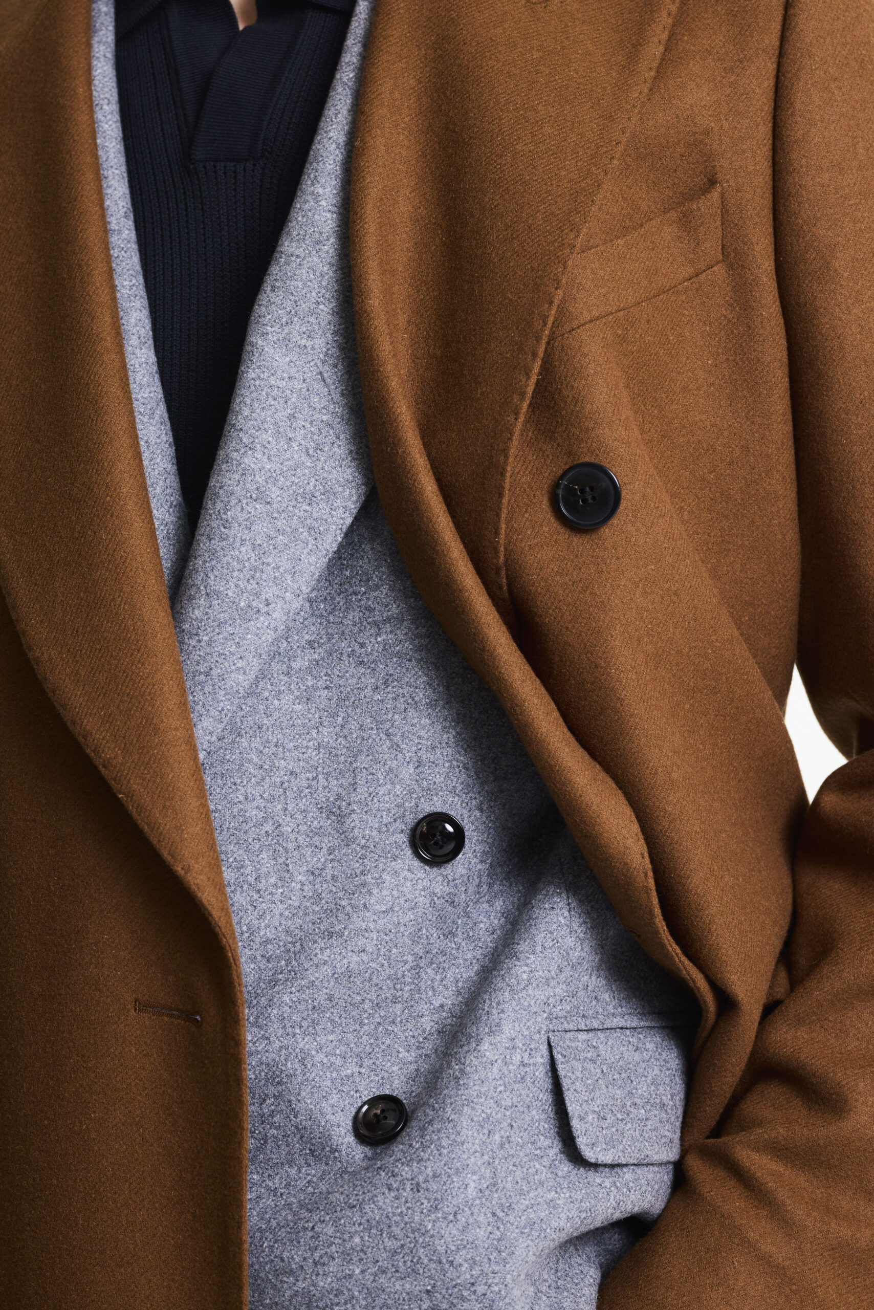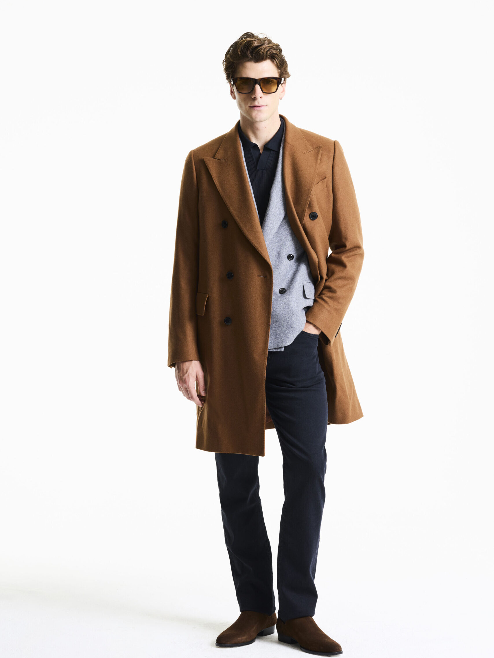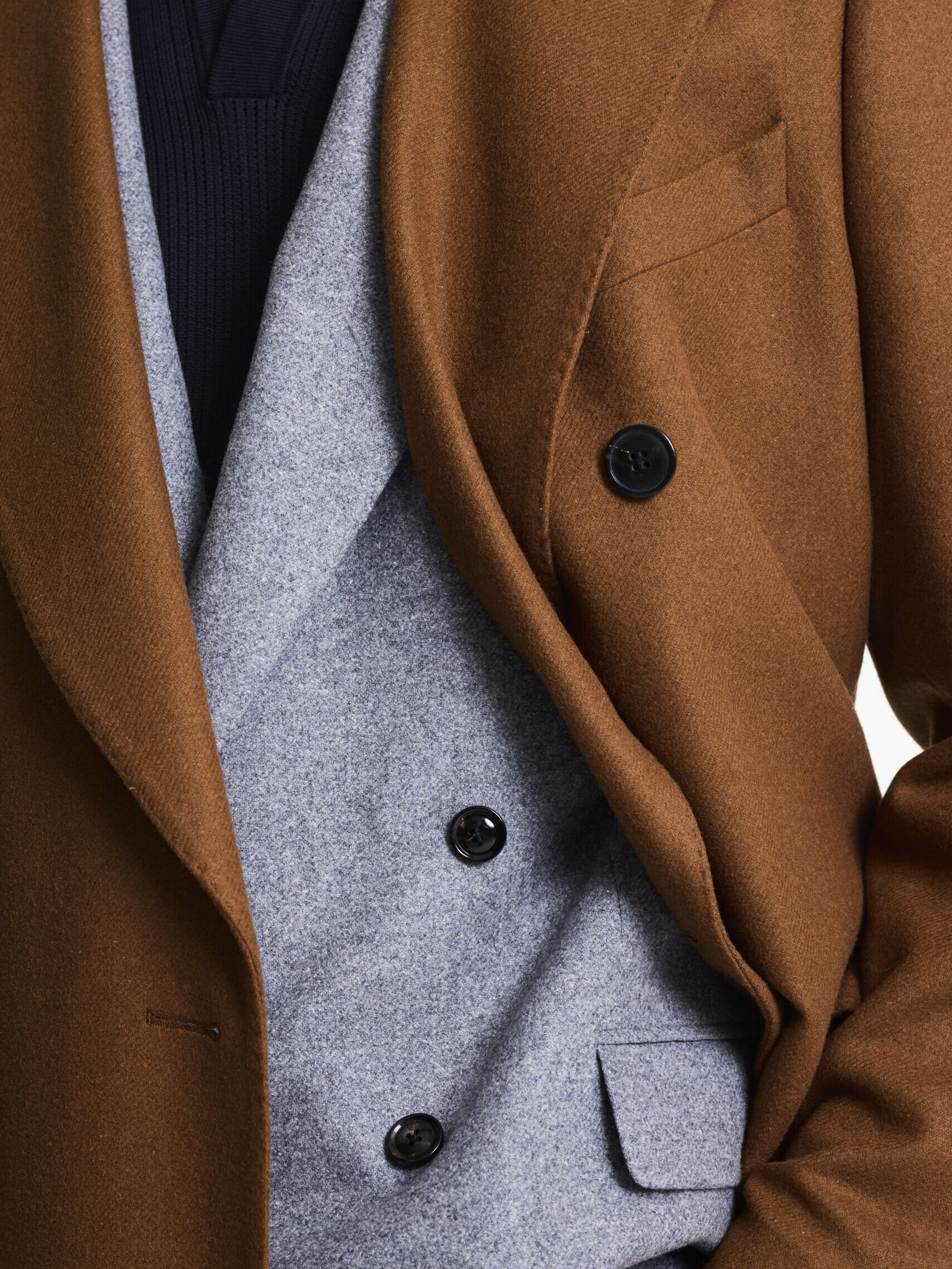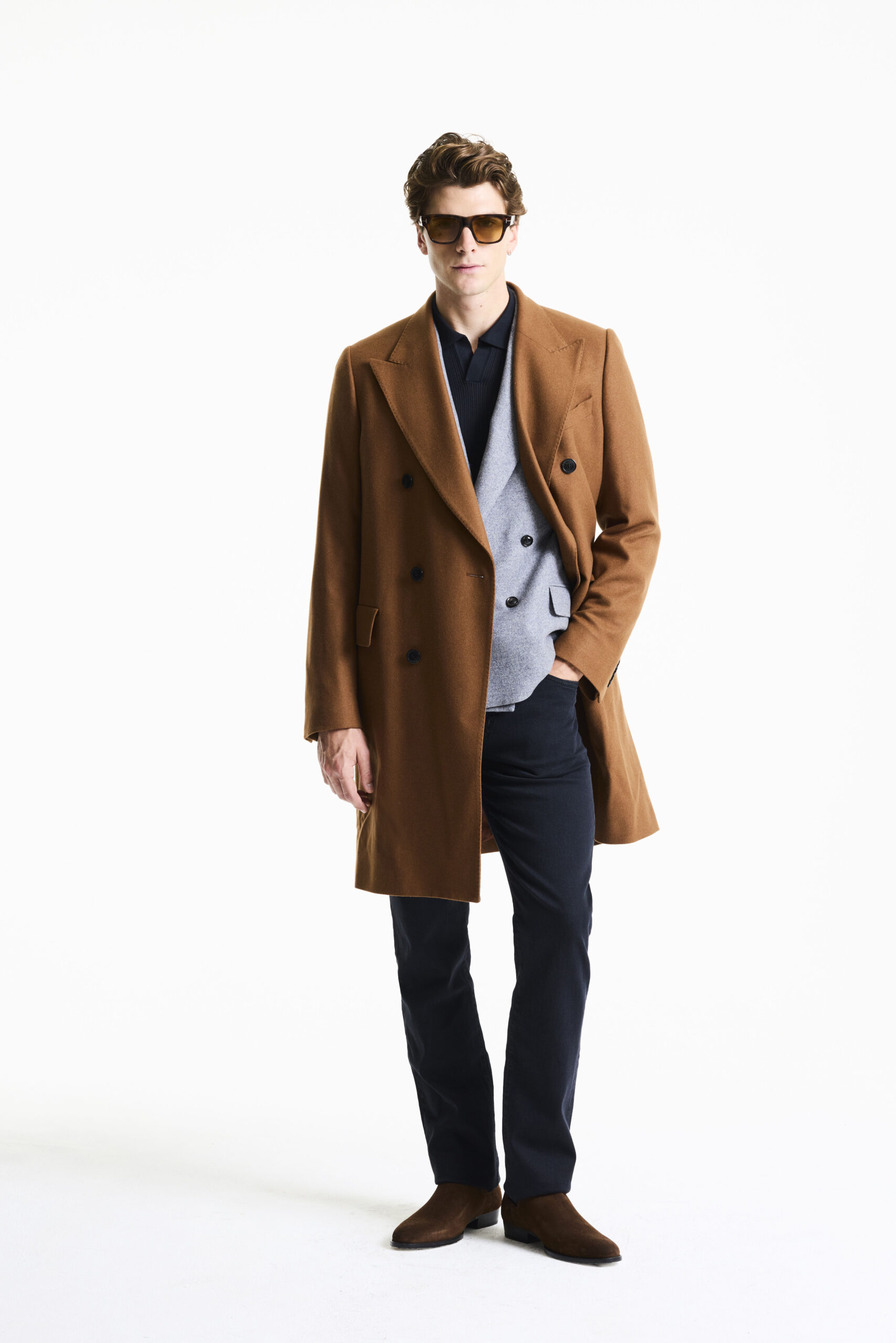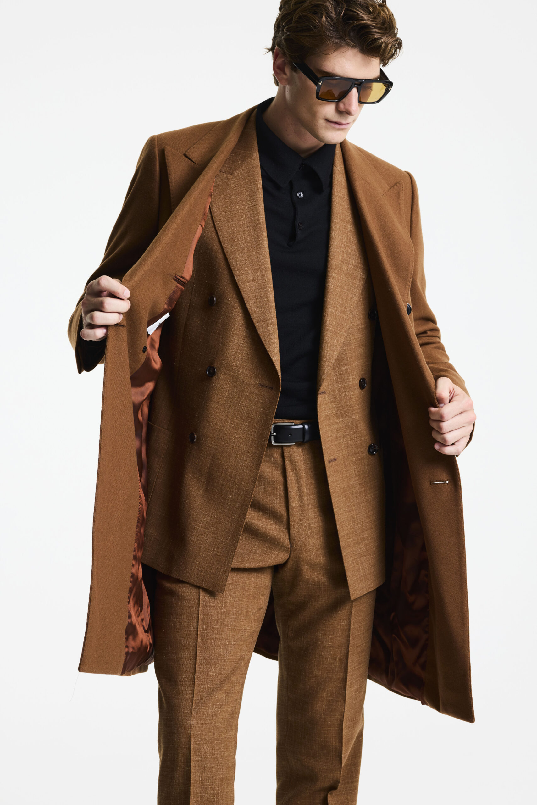 Half-canvas suit jacket with a straight shoulder and a modestly tailored fit. Trousers with a narrow, cropped leg.