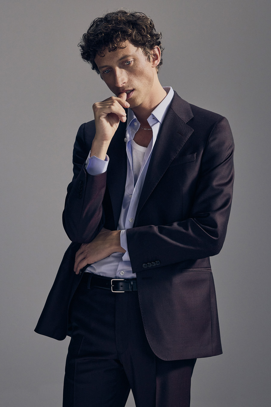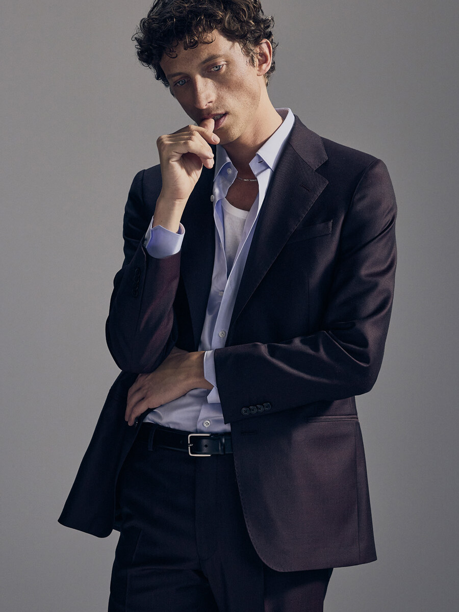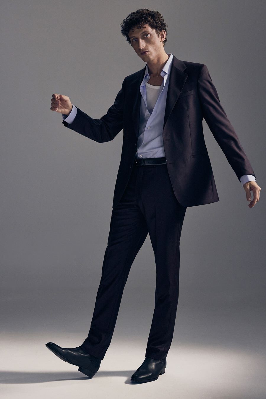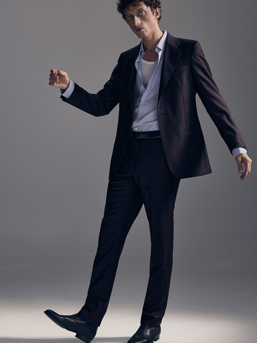 Half-canvas suit jacket with a straight shoulder and a modestly tailored fit. Trousers with a narrow, cropped leg.