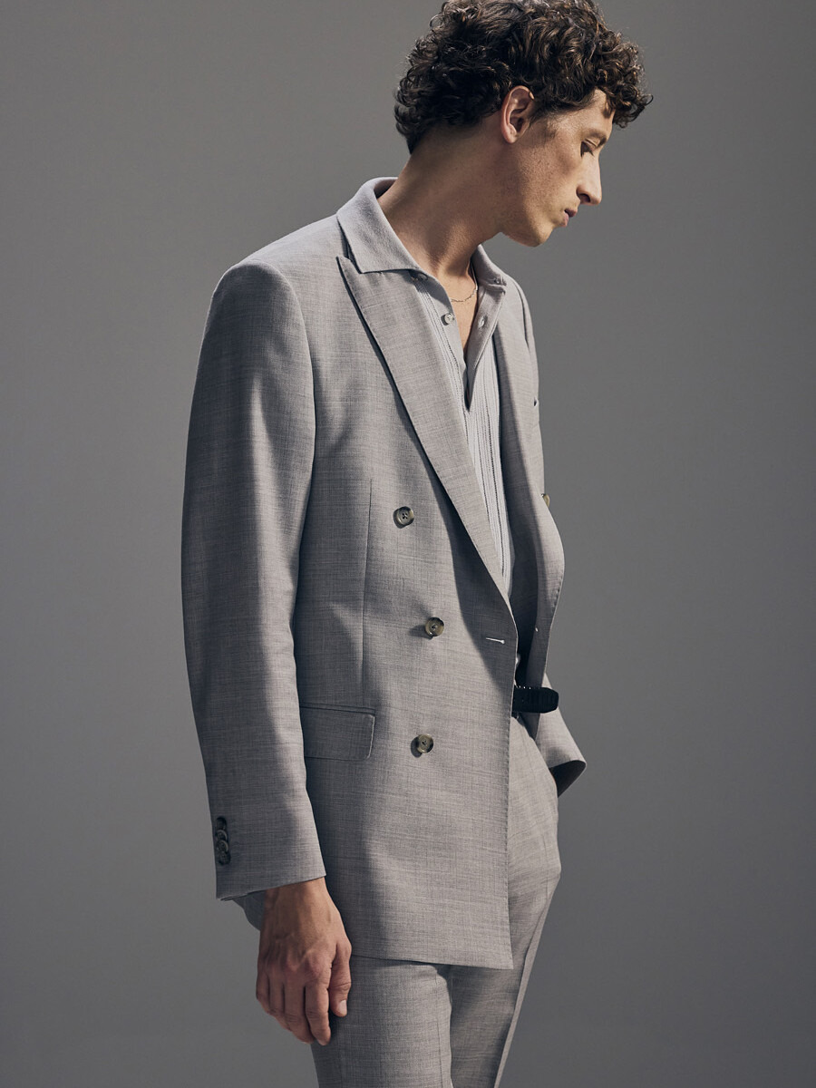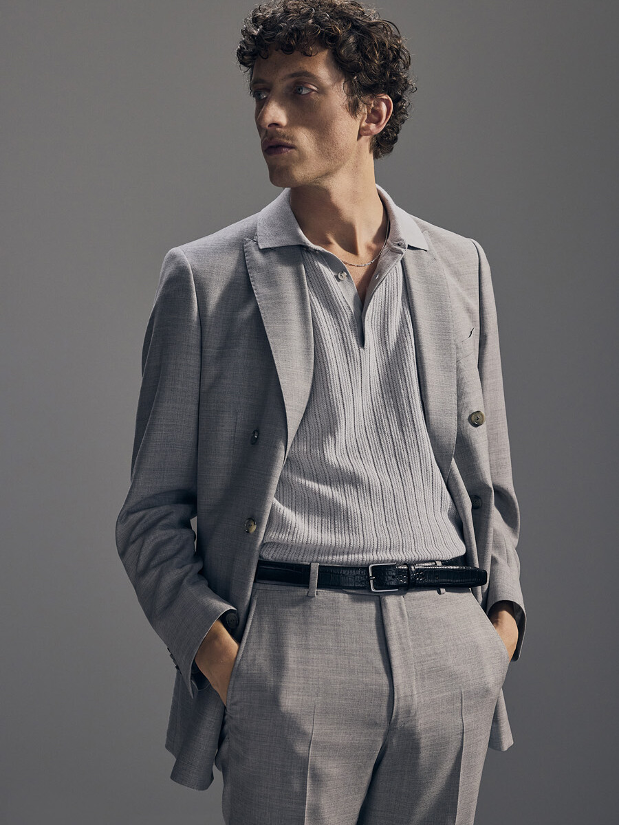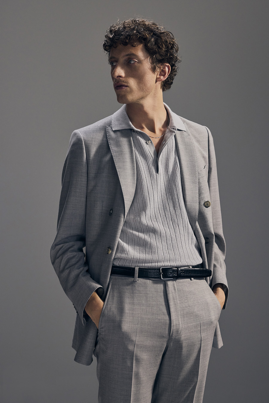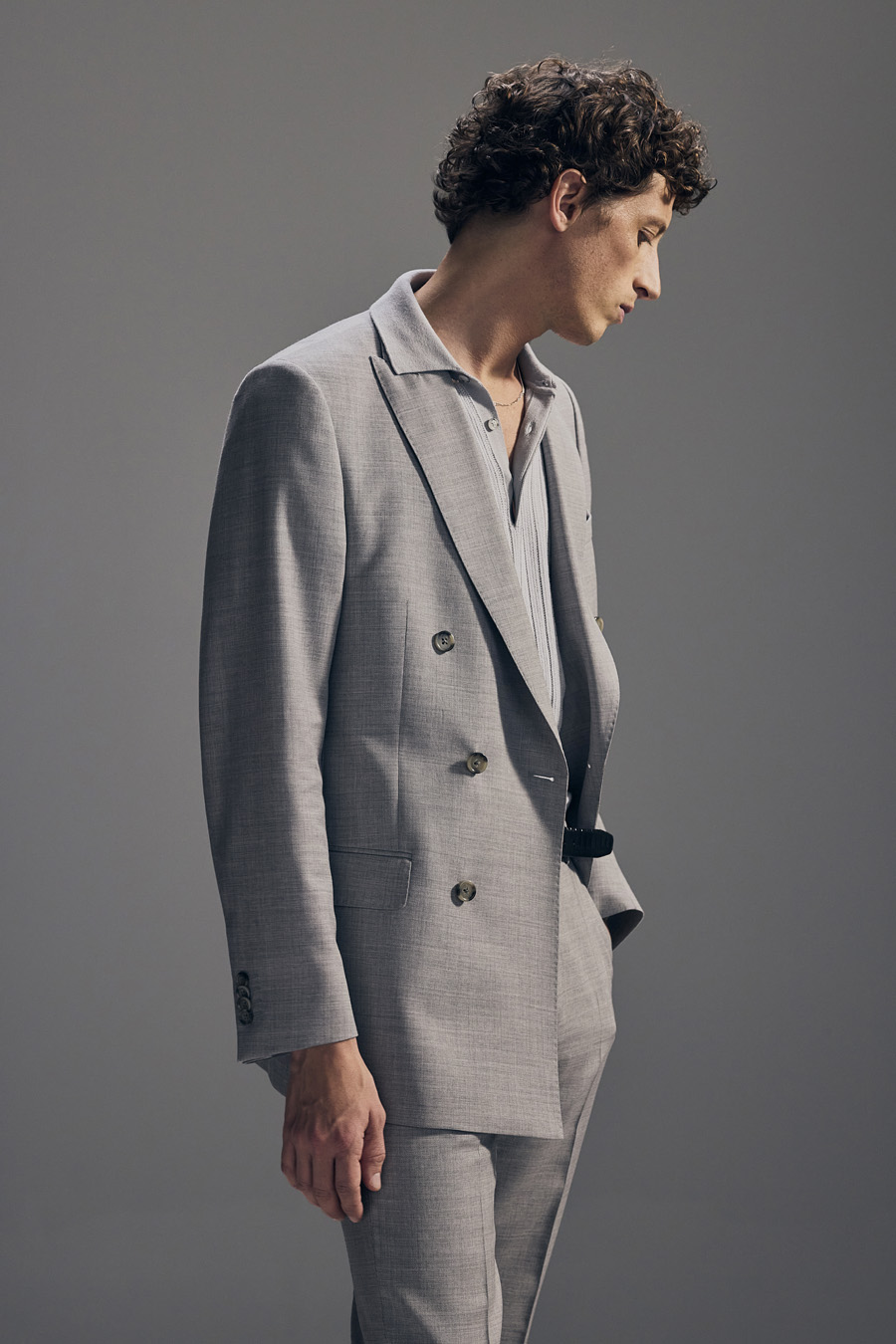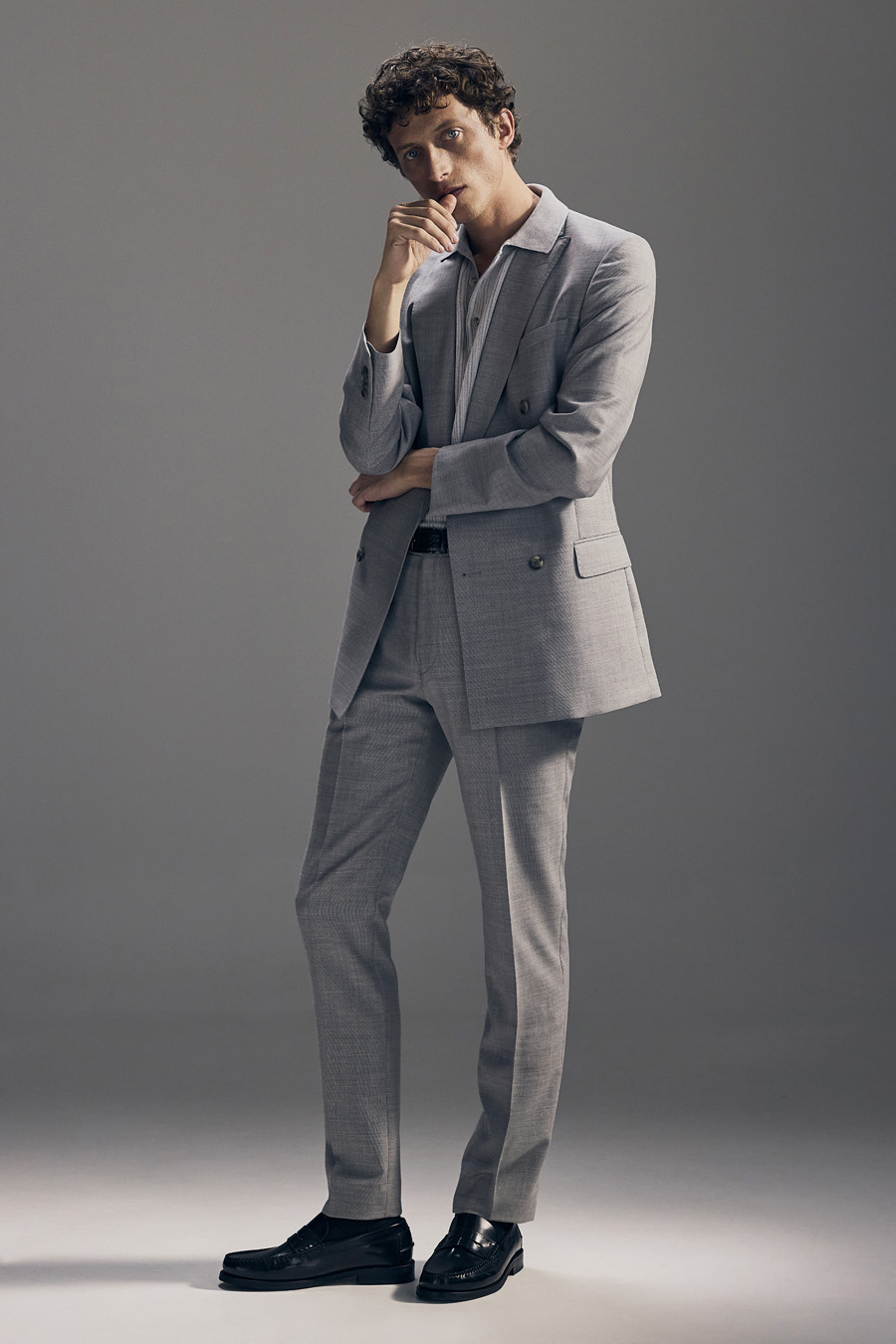 Half-canvas suit jacket with a straight shoulder and a modestly tailored fit. Trousers with a narrow, cropped leg.