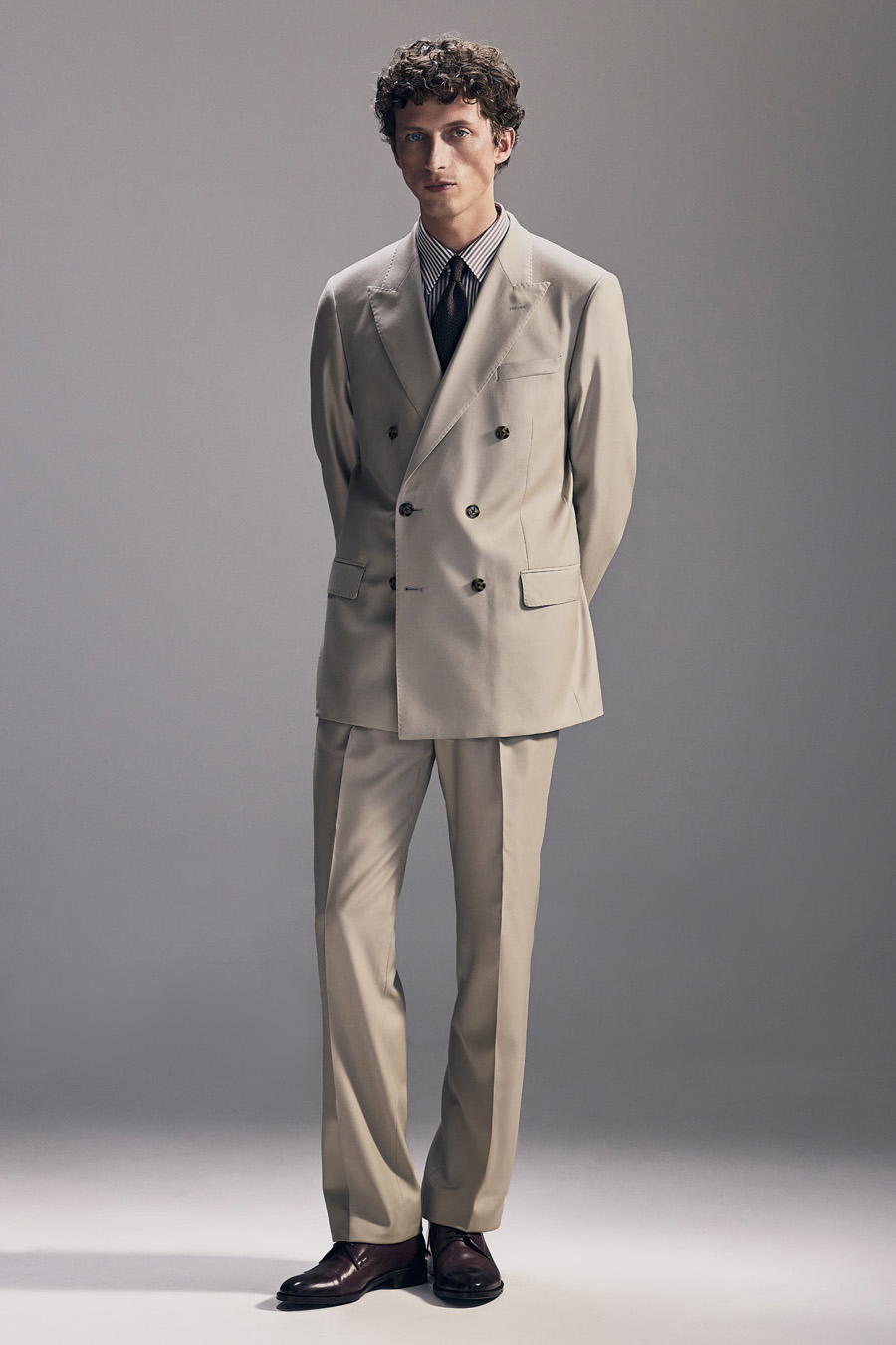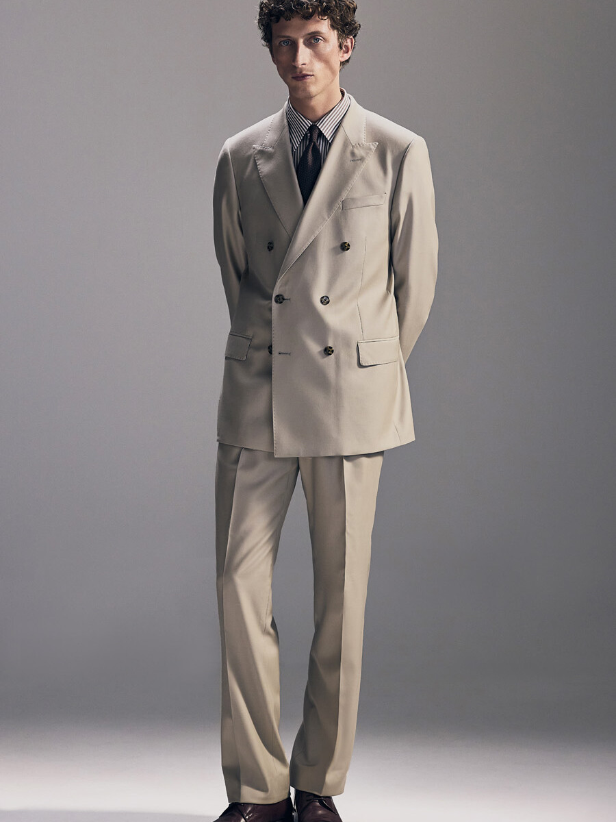 Half-canvas suit jacket with a straight shoulder and a modestly tailored fit. Trousers with a narrow, cropped leg.