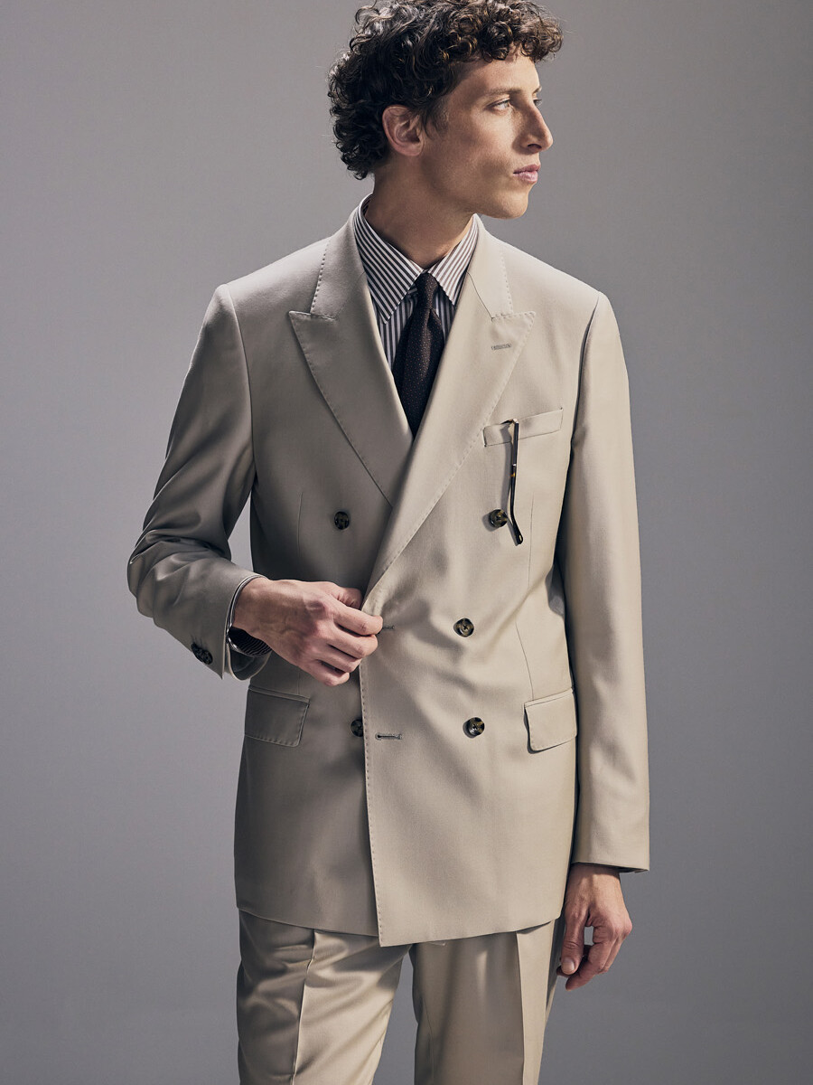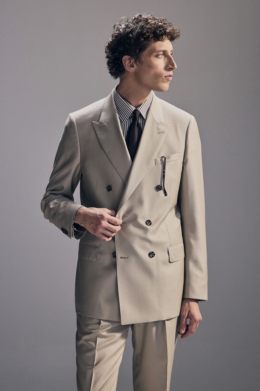 Half-canvas suit with classic smoking-shawl lapels, a straight shoulder, jetted pockets on a single button jacket. Mid-rise trousers with belt loops, zipper-fly, flat front.