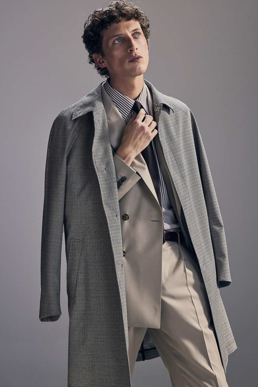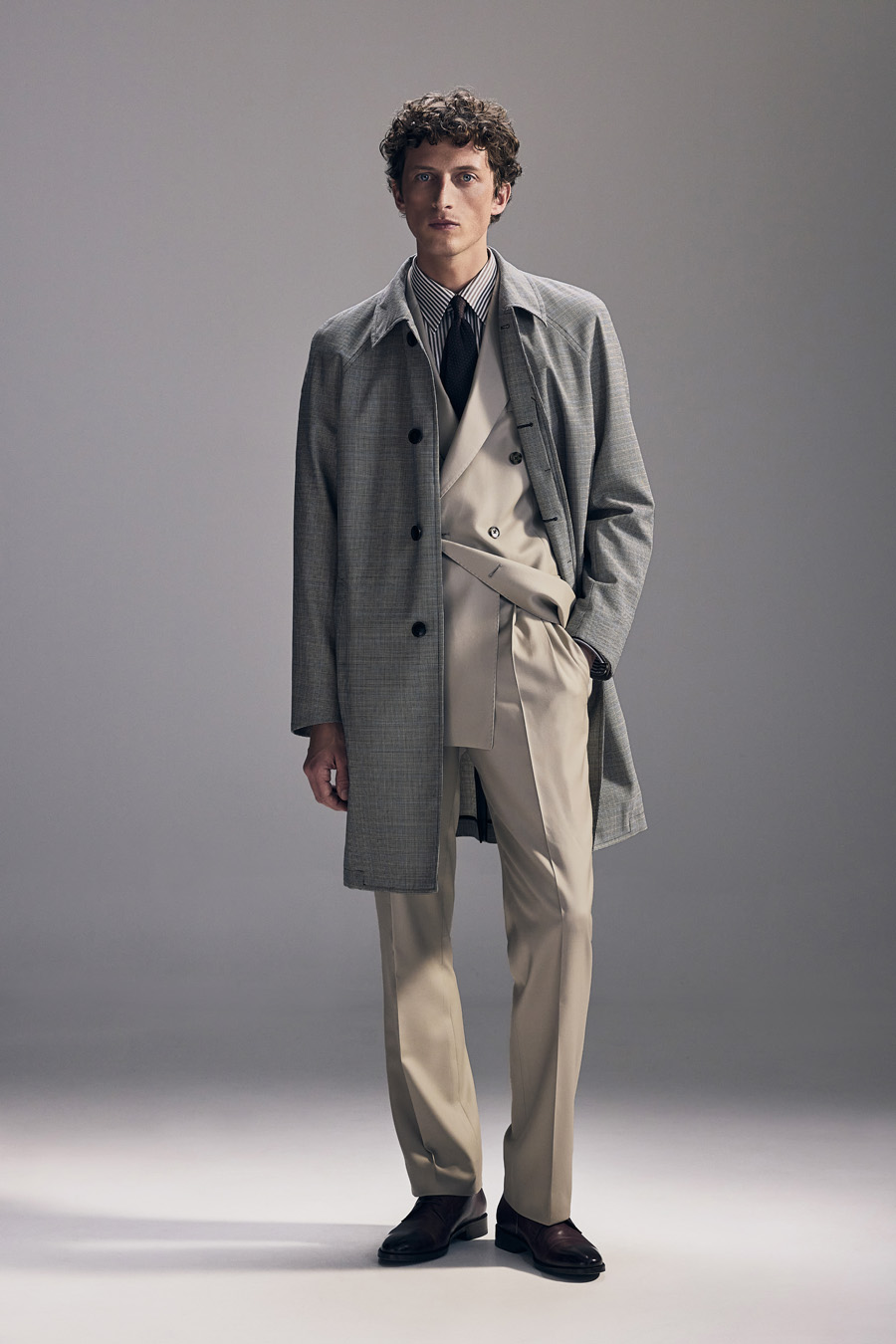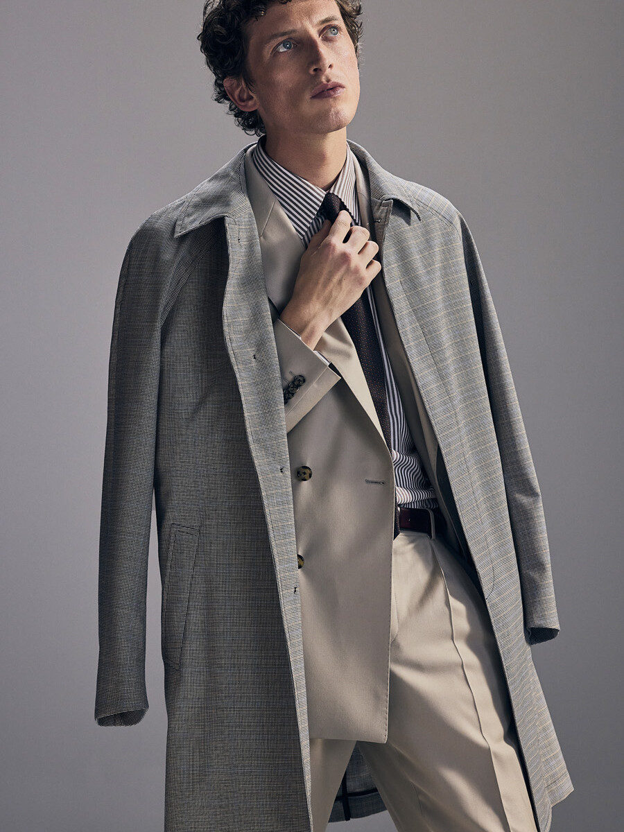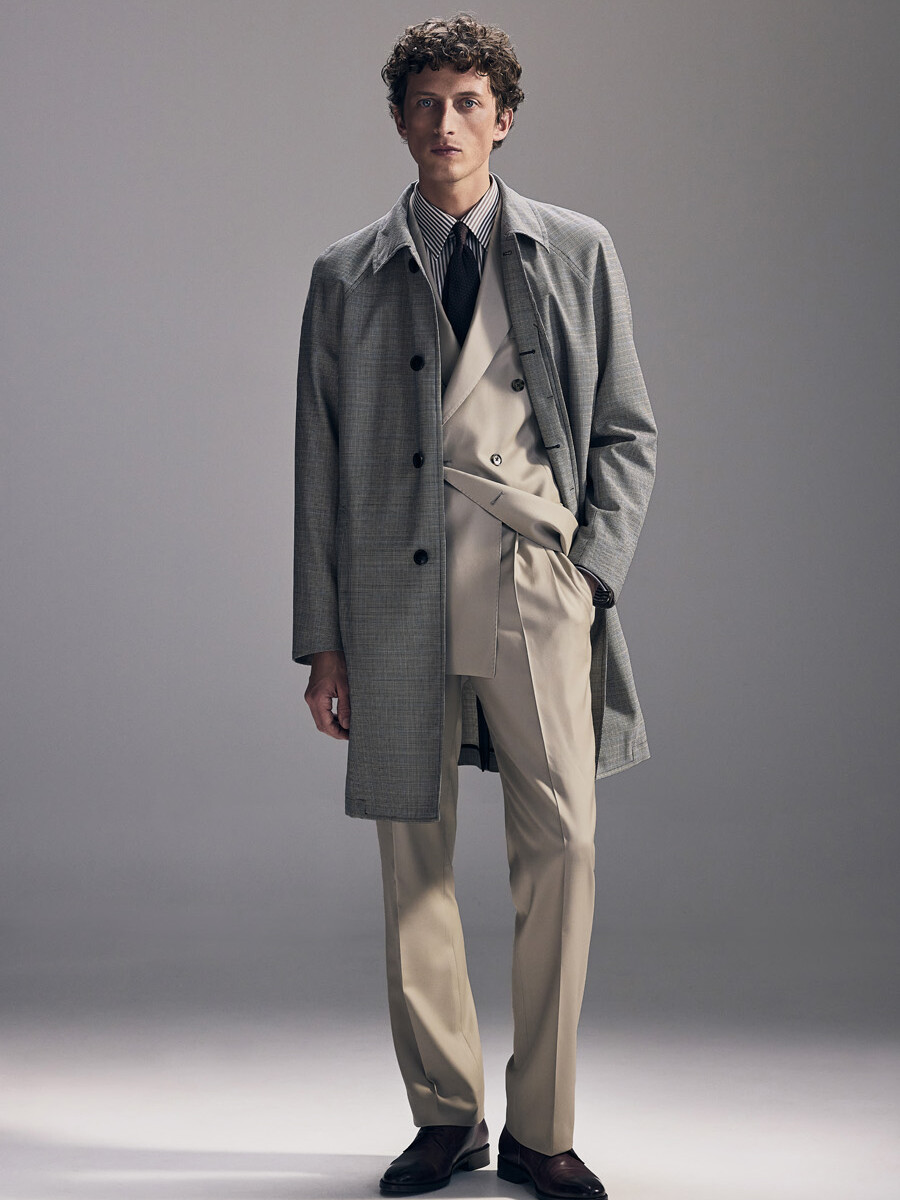 Half-canvas suit jacket with a straight shoulder and a modestly tailored fit. Trousers with a narrow, cropped leg.