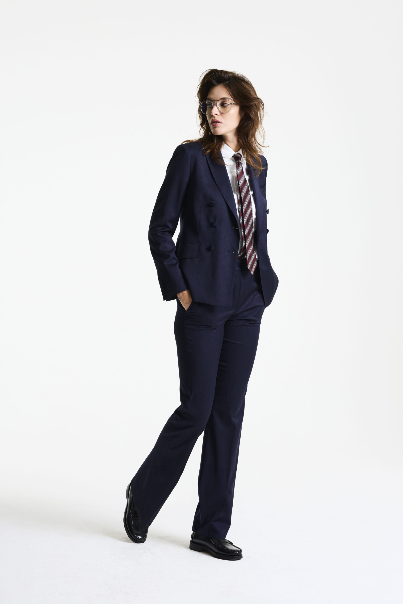Half-canvas suit jacket with a straight shoulder and a modestly tailored fit. Trousers with a narrow, cropped leg.