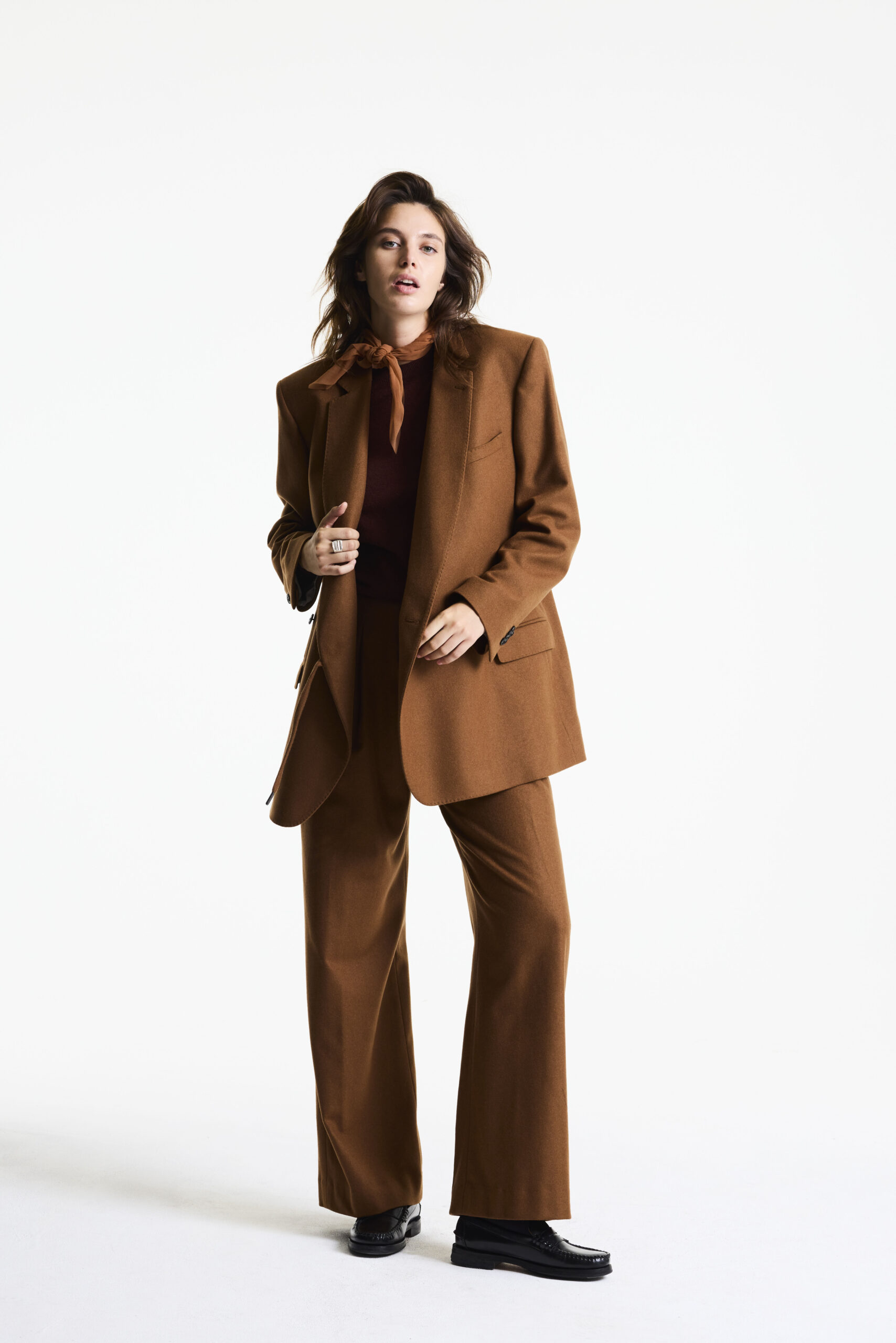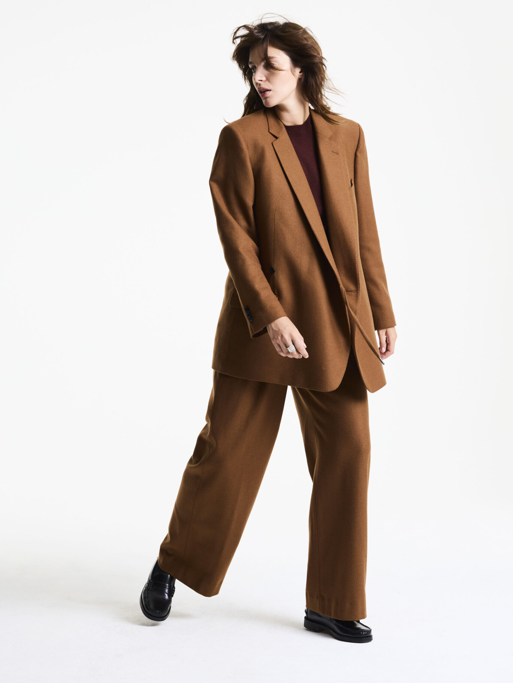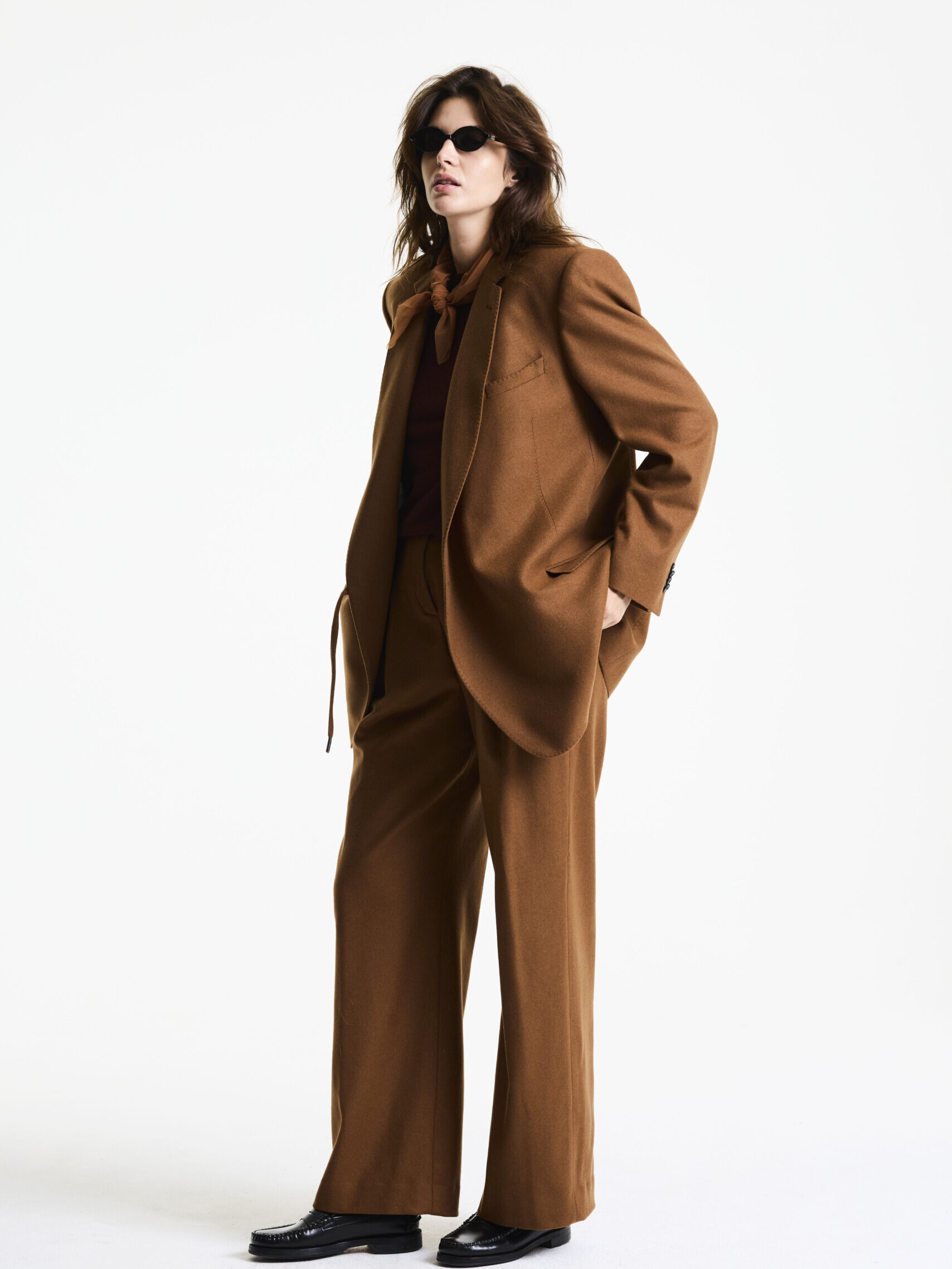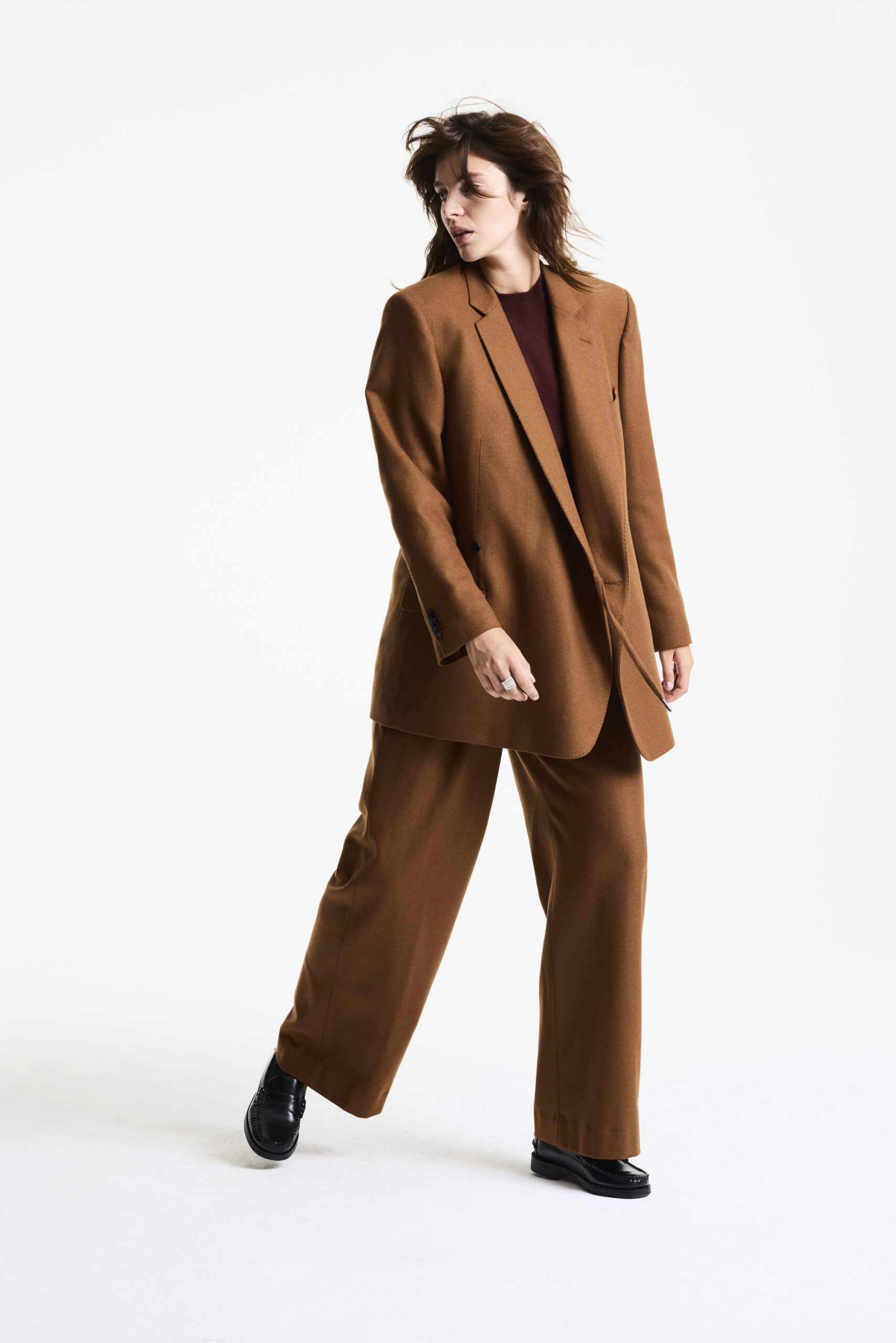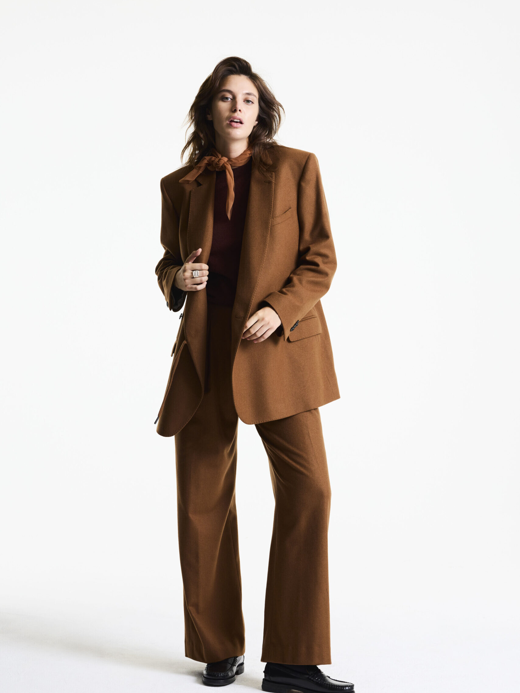 Half-canvas suit jacket with a straight shoulder and a modestly tailored fit. Trousers with a narrow, cropped leg.