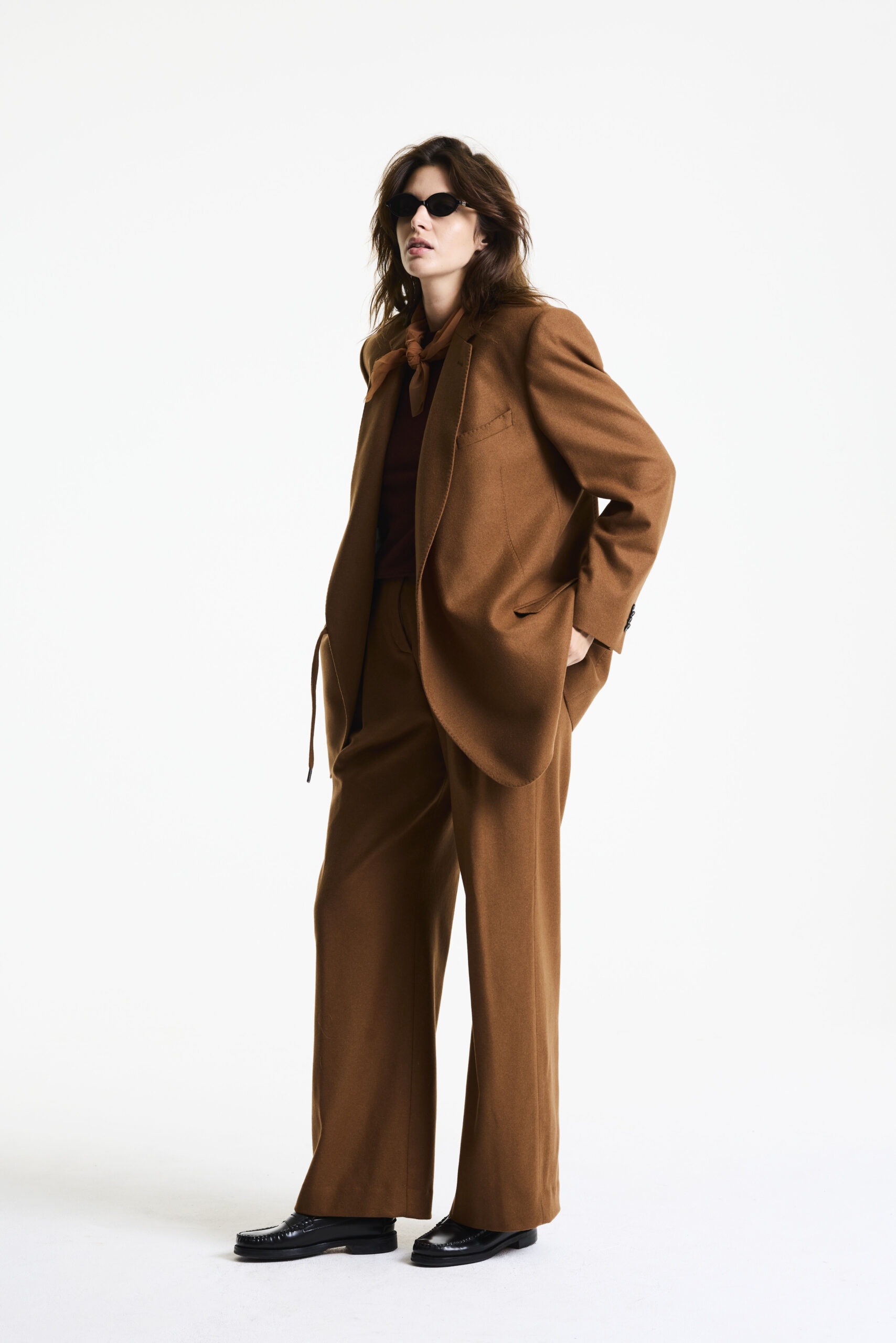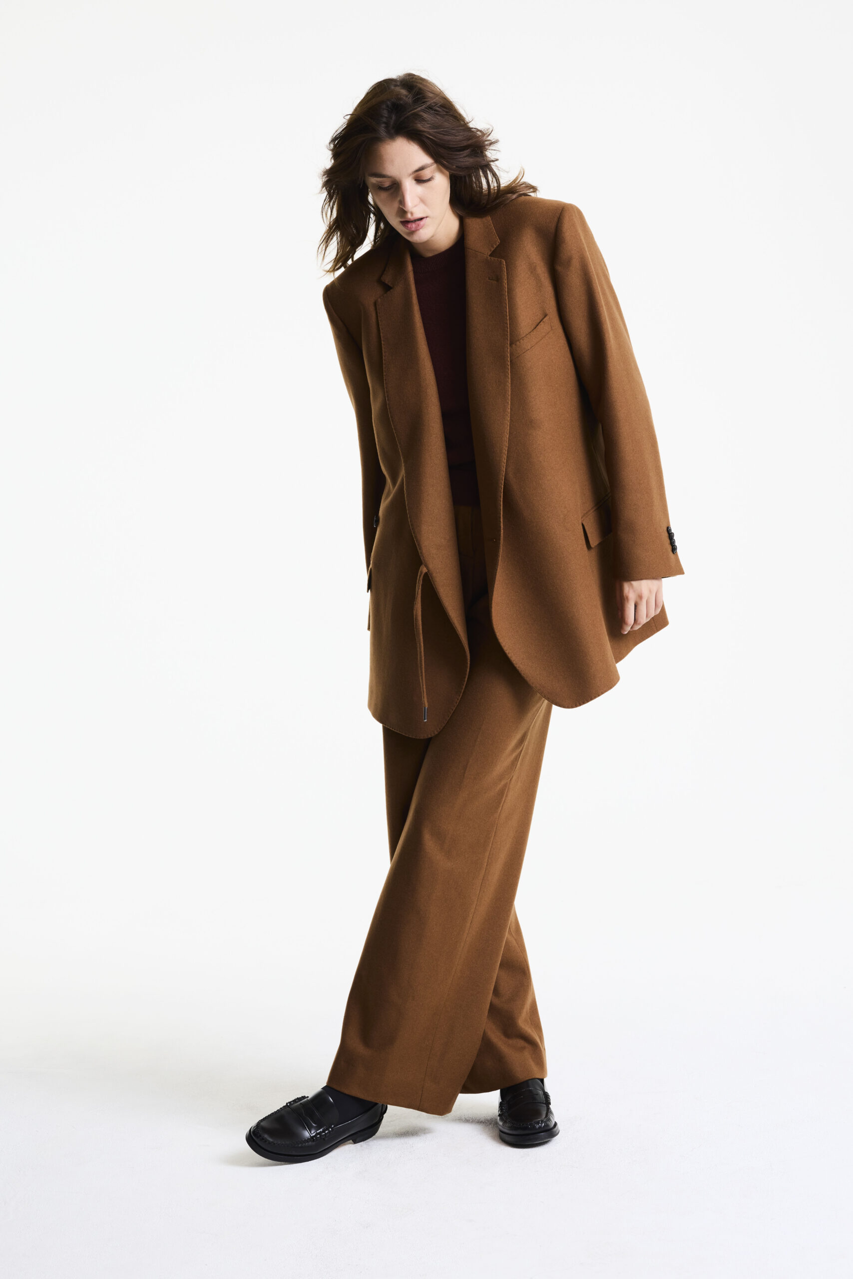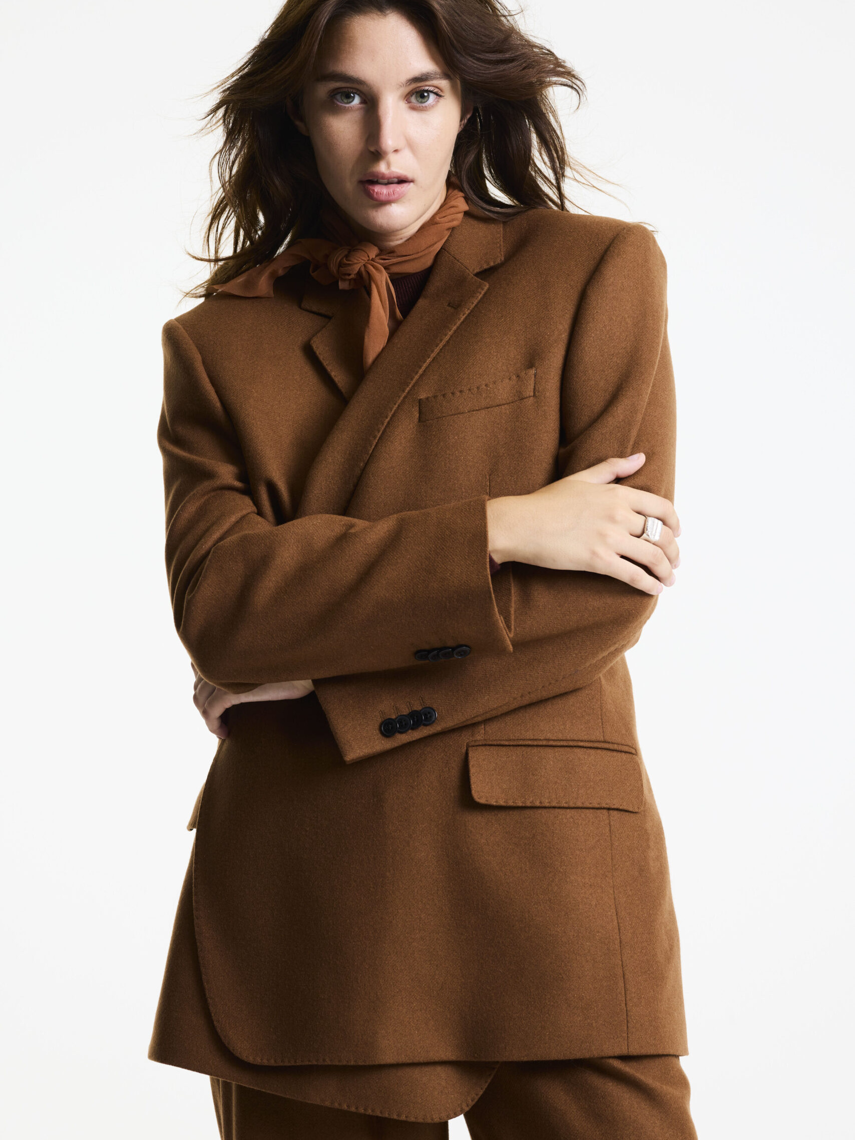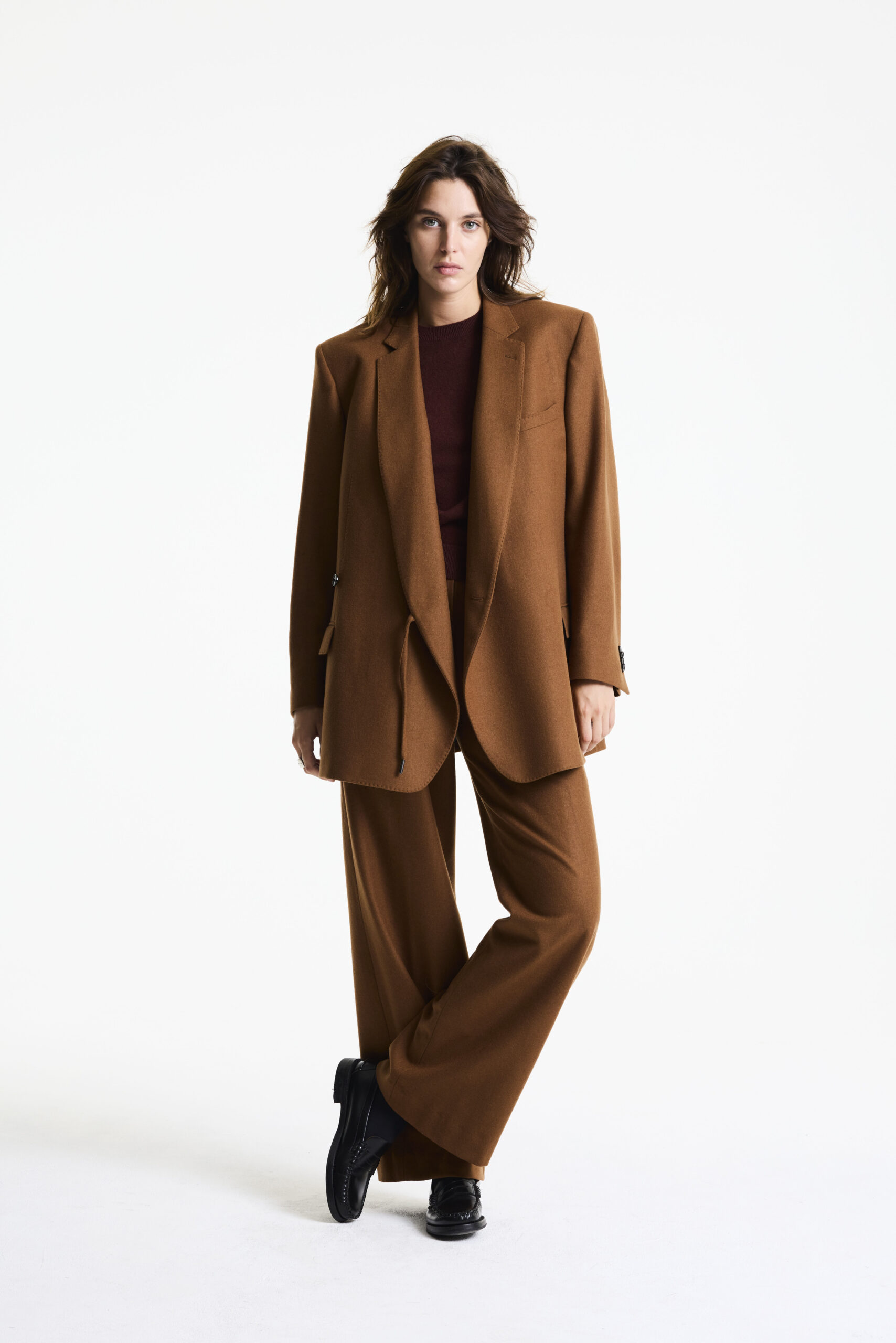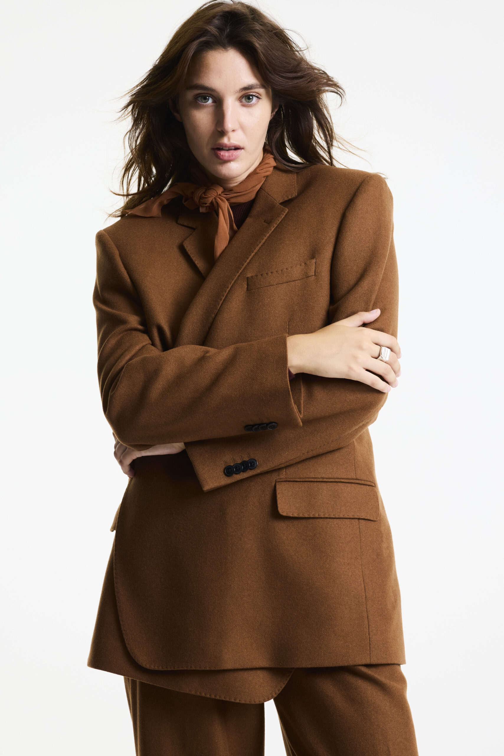 Half-canvas suit jacket with a straight shoulder and a modestly tailored fit. Trousers with a narrow, cropped leg.