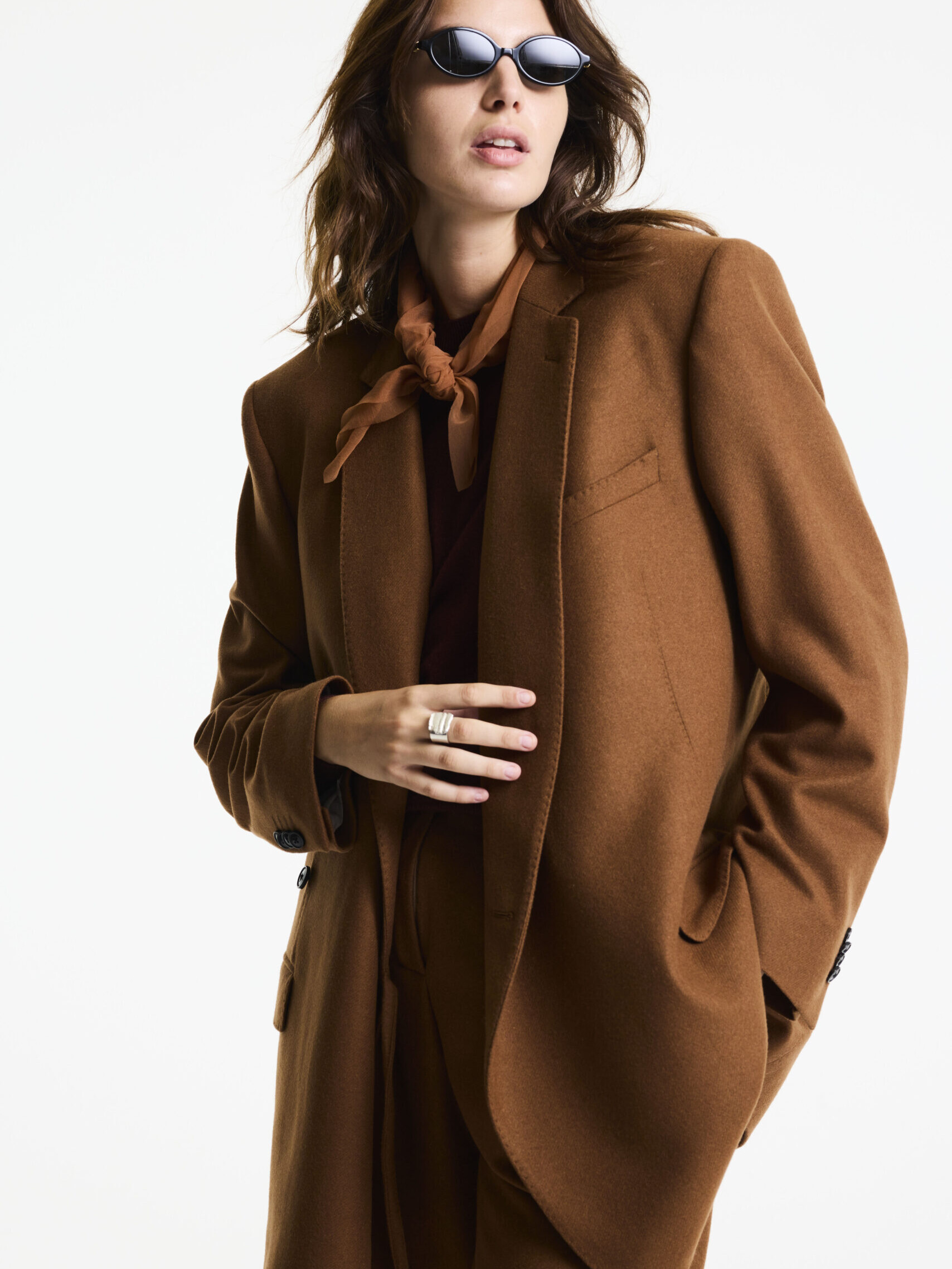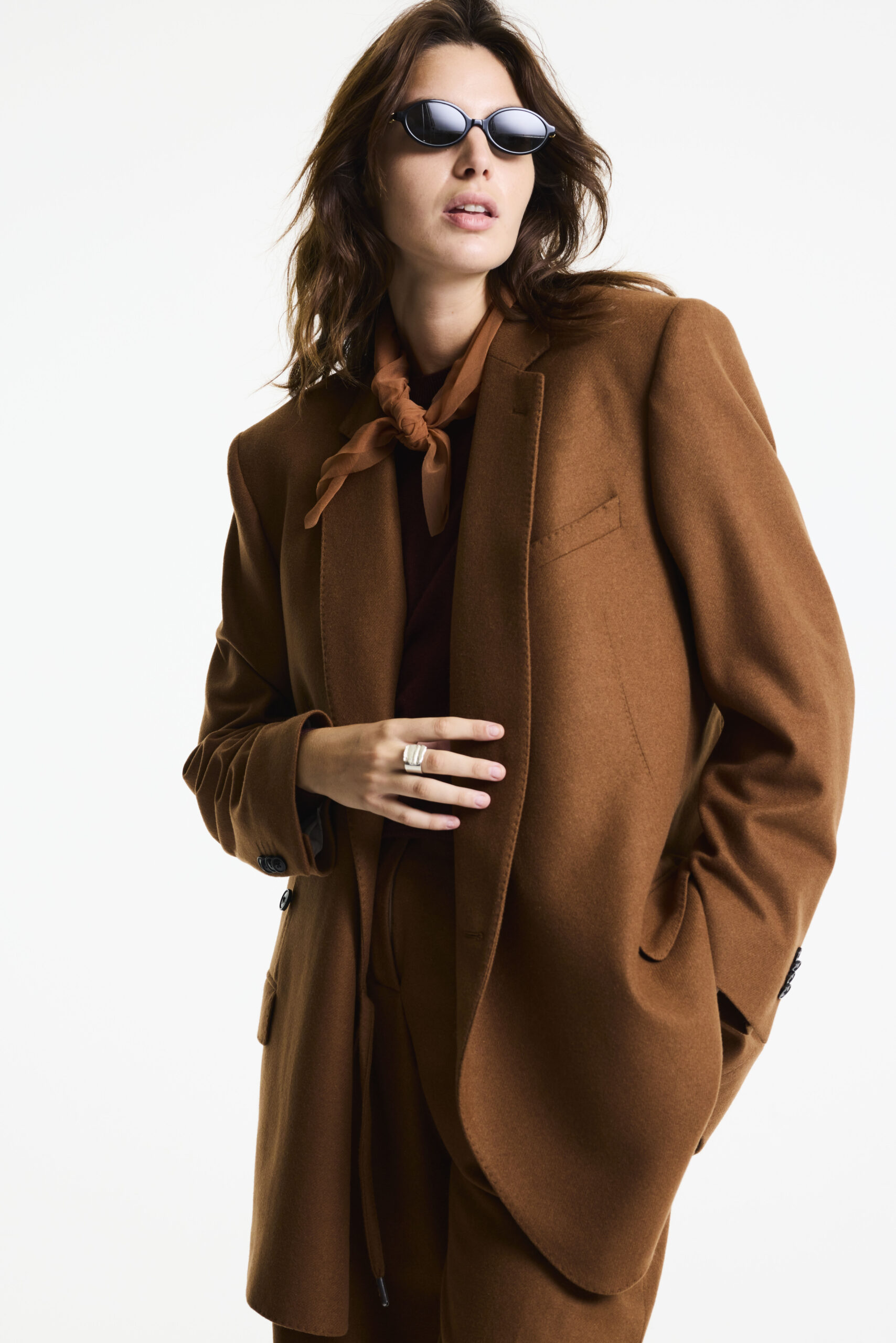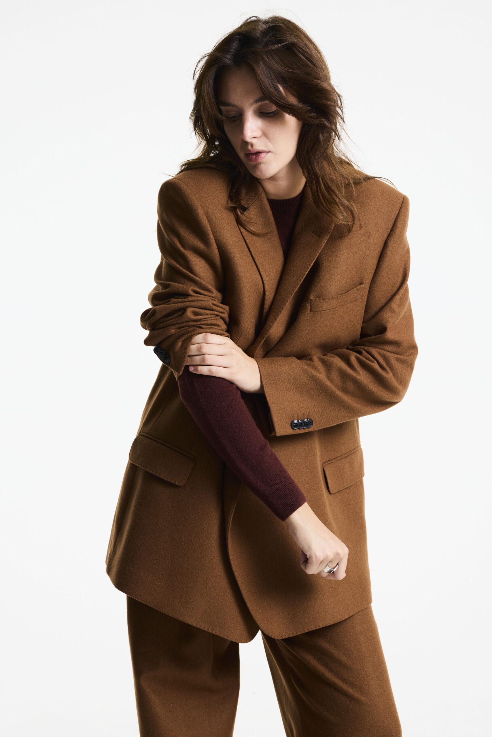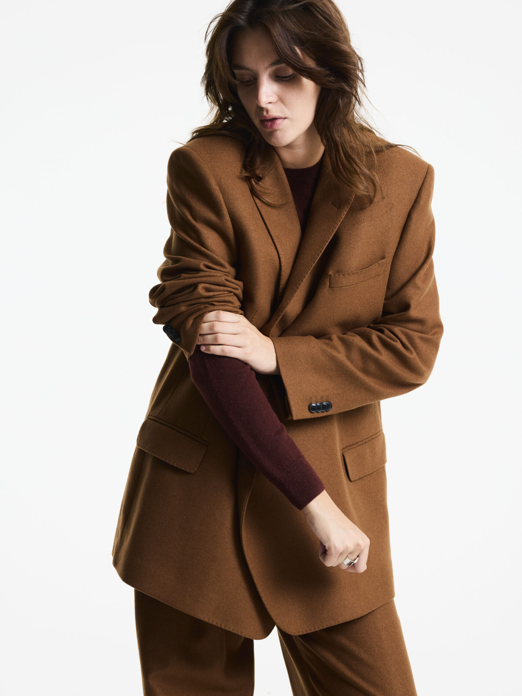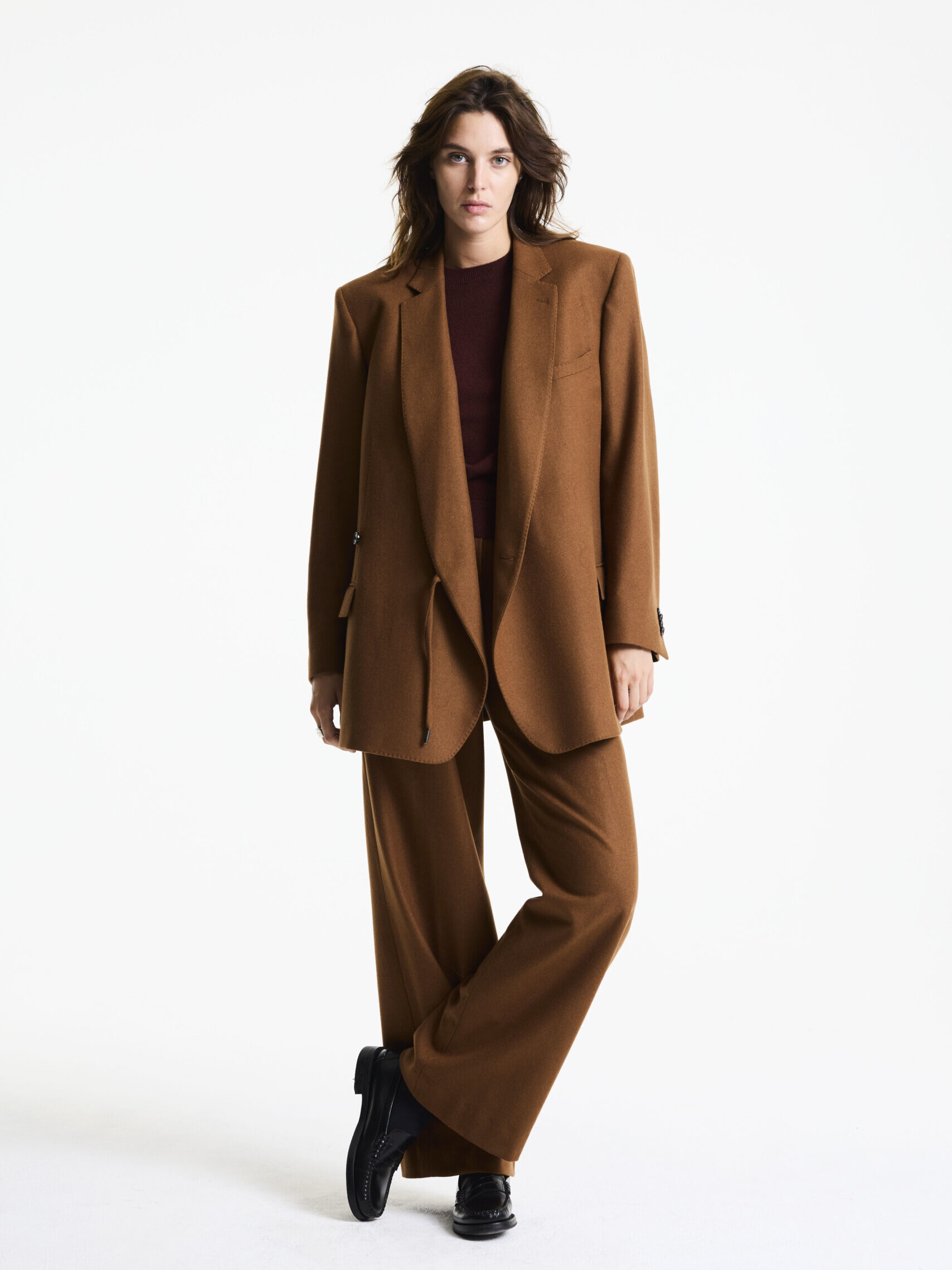 Half-canvas suit jacket with a straight shoulder and a modestly tailored fit. Trousers with a narrow, cropped leg.