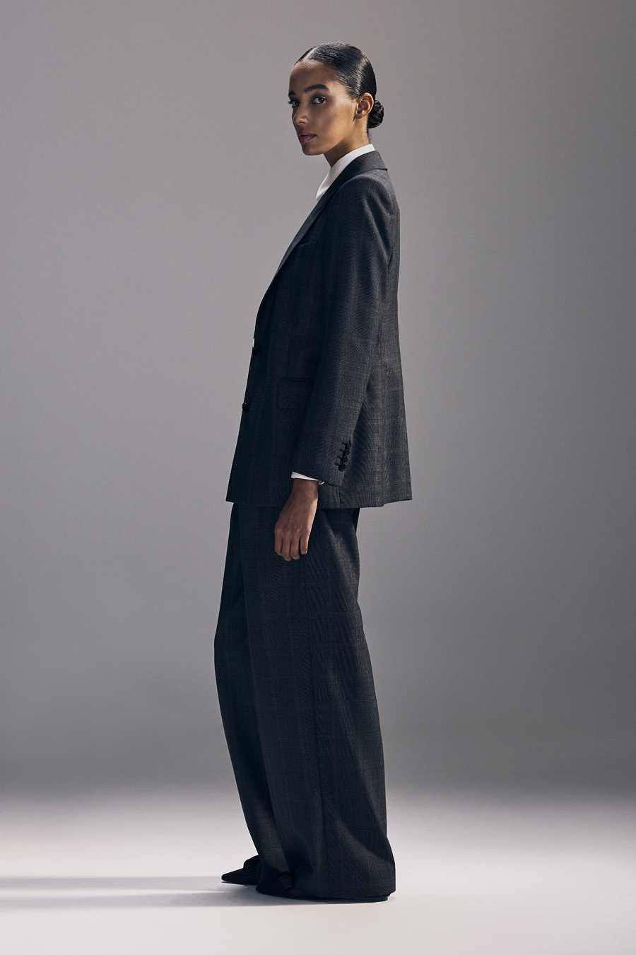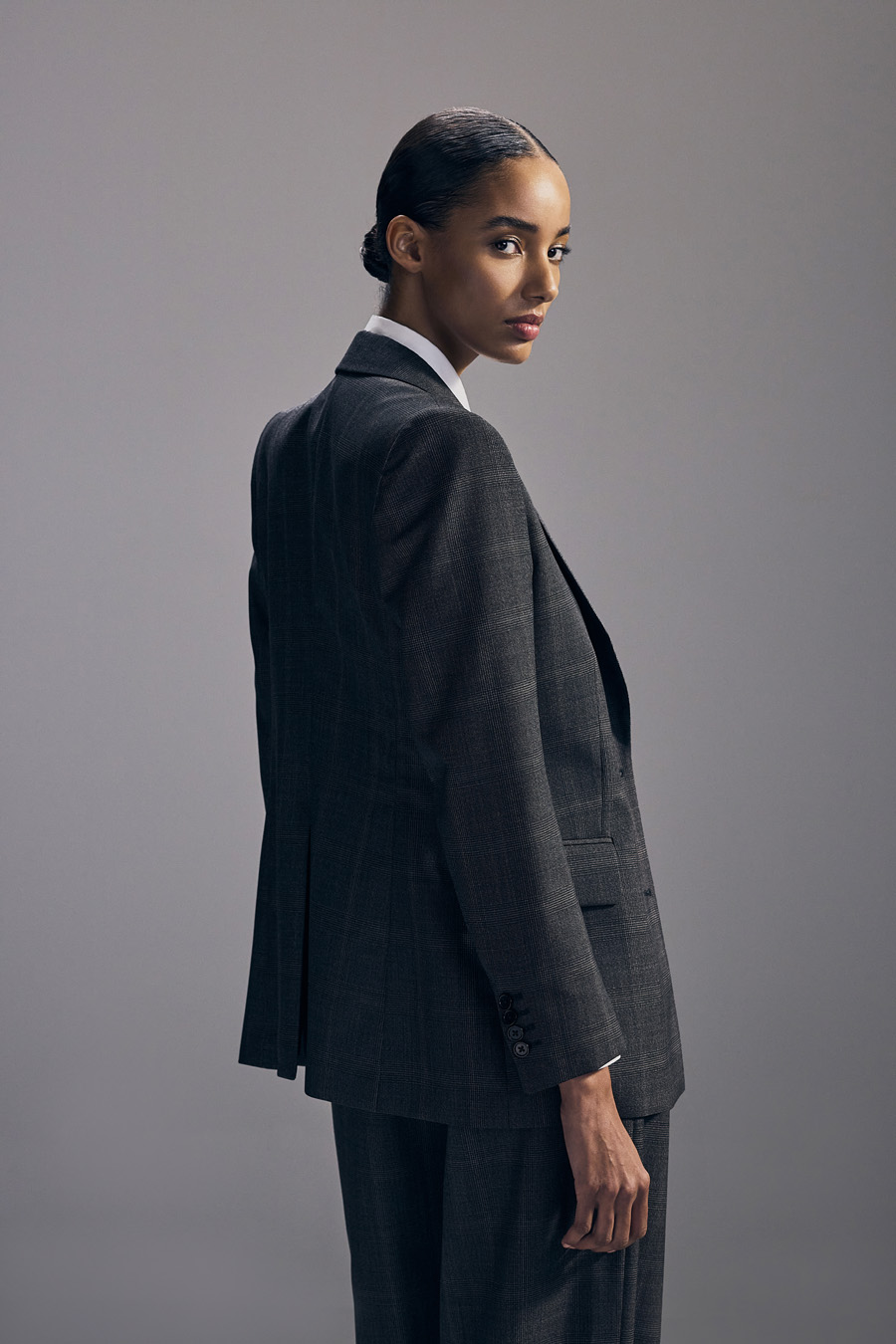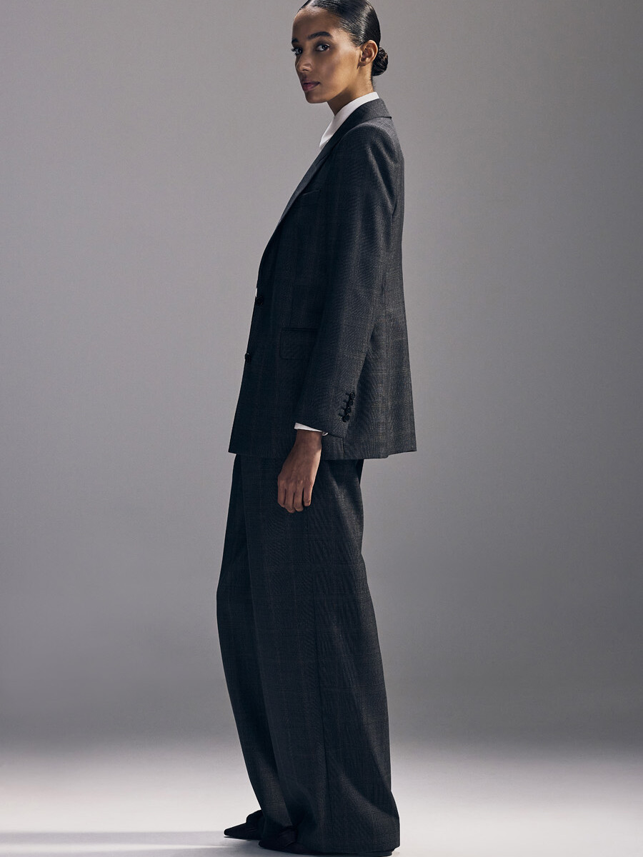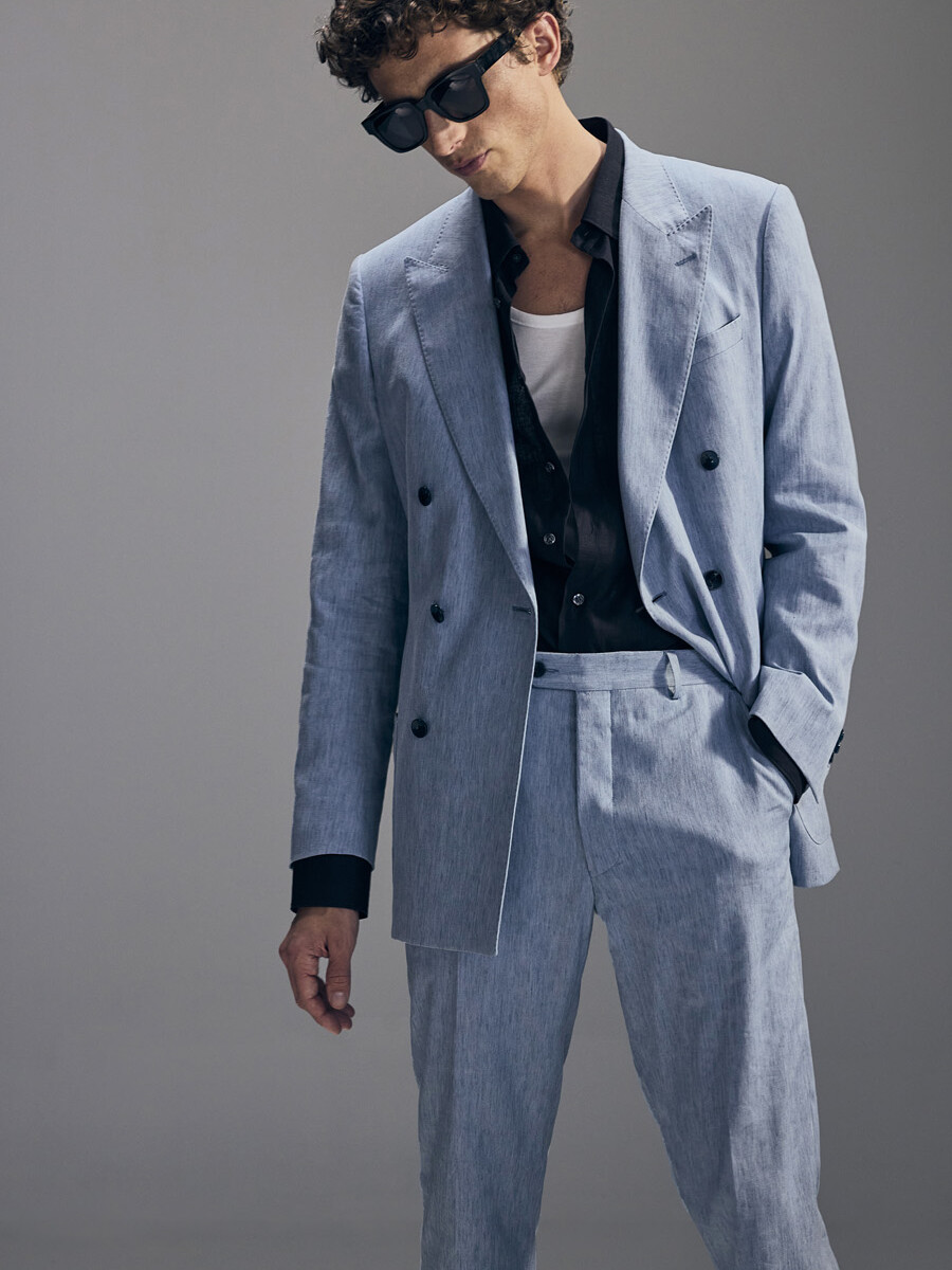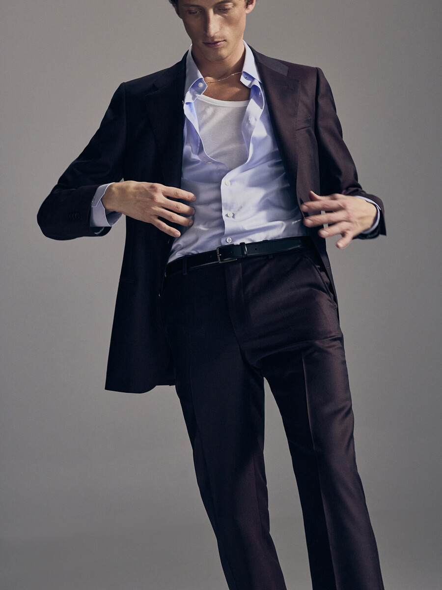 Half-canvas suit jacket with a straight shoulder and a modestly tailored fit. Trousers with a narrow, cropped leg.