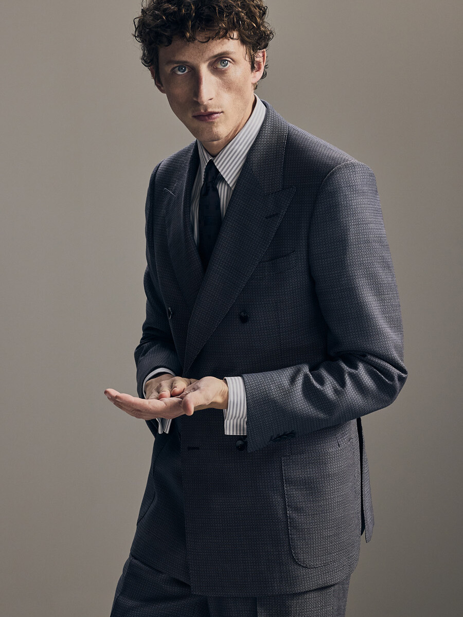 Half-canvas suit with classic smoking-shawl lapels, a straight shoulder, jetted pockets on a single button jacket. Mid-rise trousers with belt loops, zipper-fly, flat front.