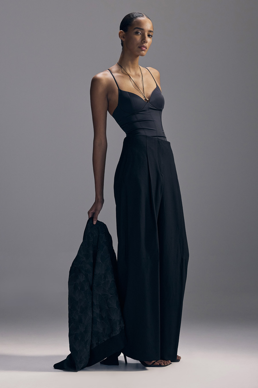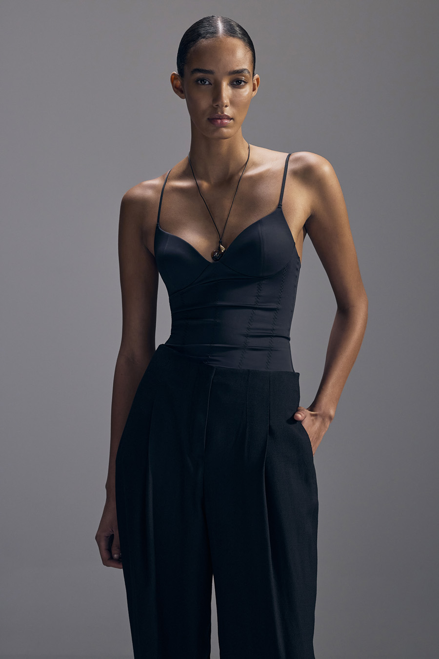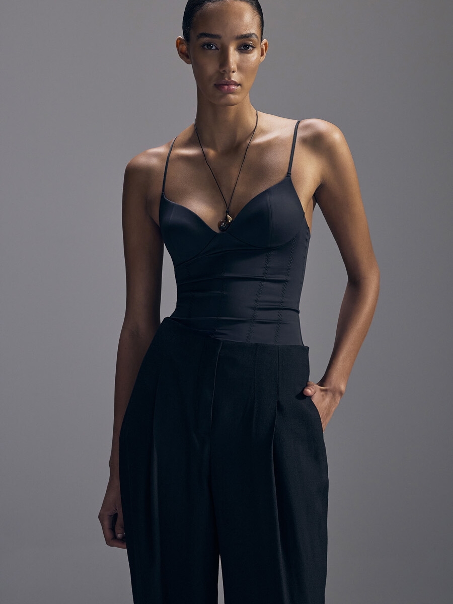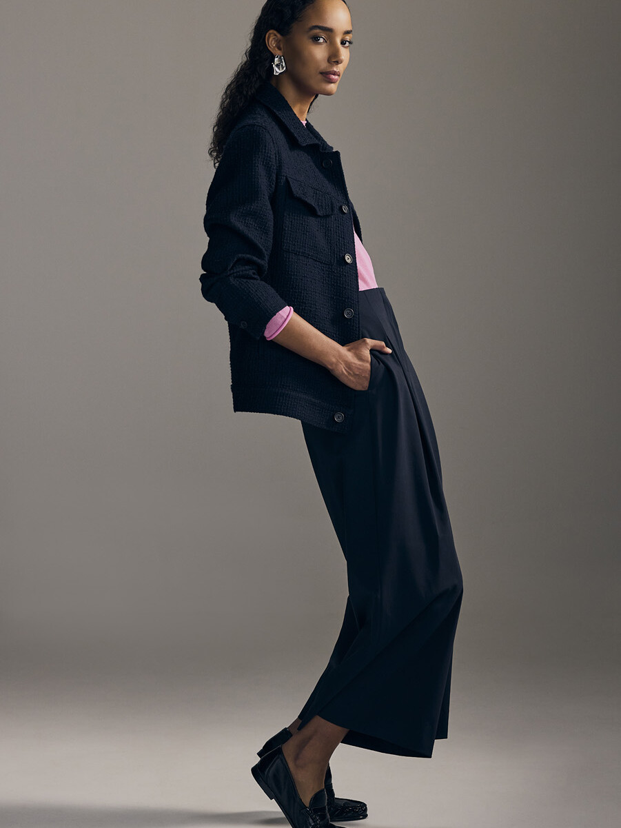 Half-canvas suit jacket with a straight shoulder and a modestly tailored fit. Trousers with a narrow, cropped leg.