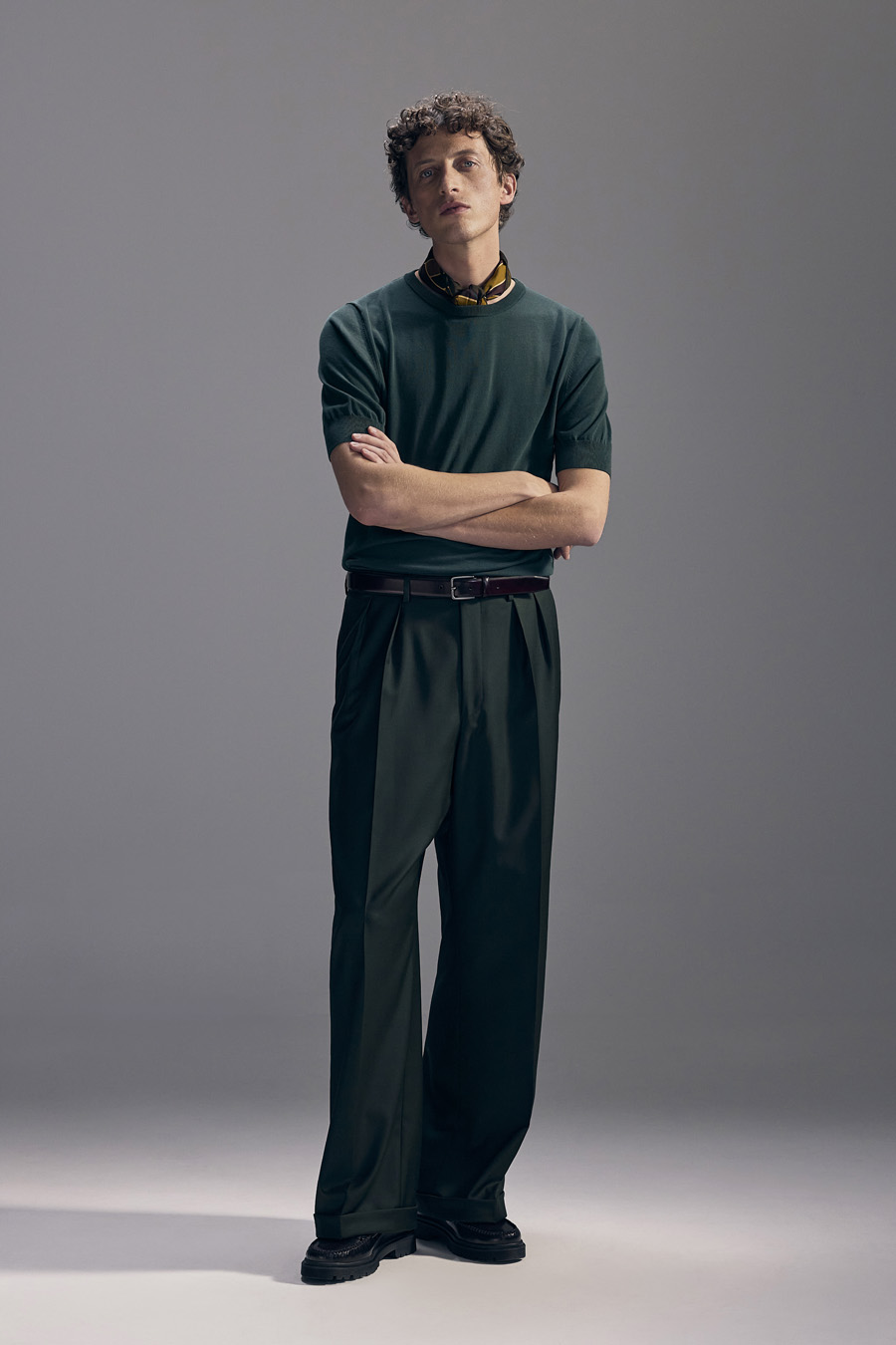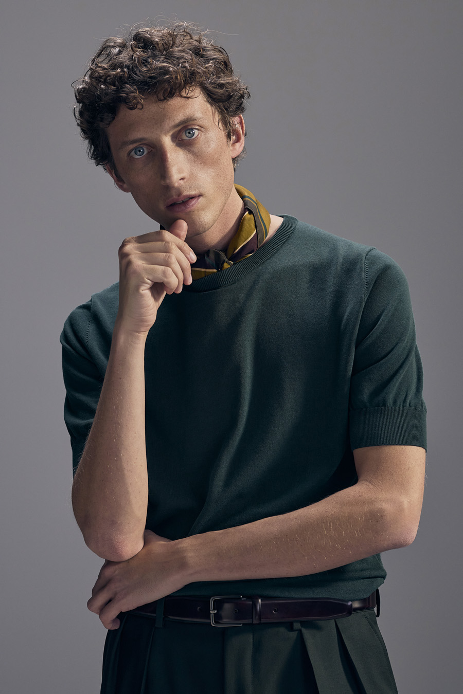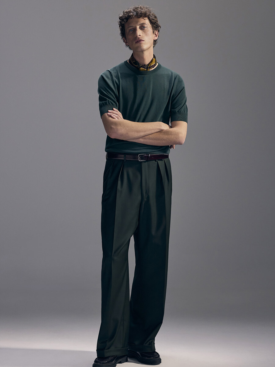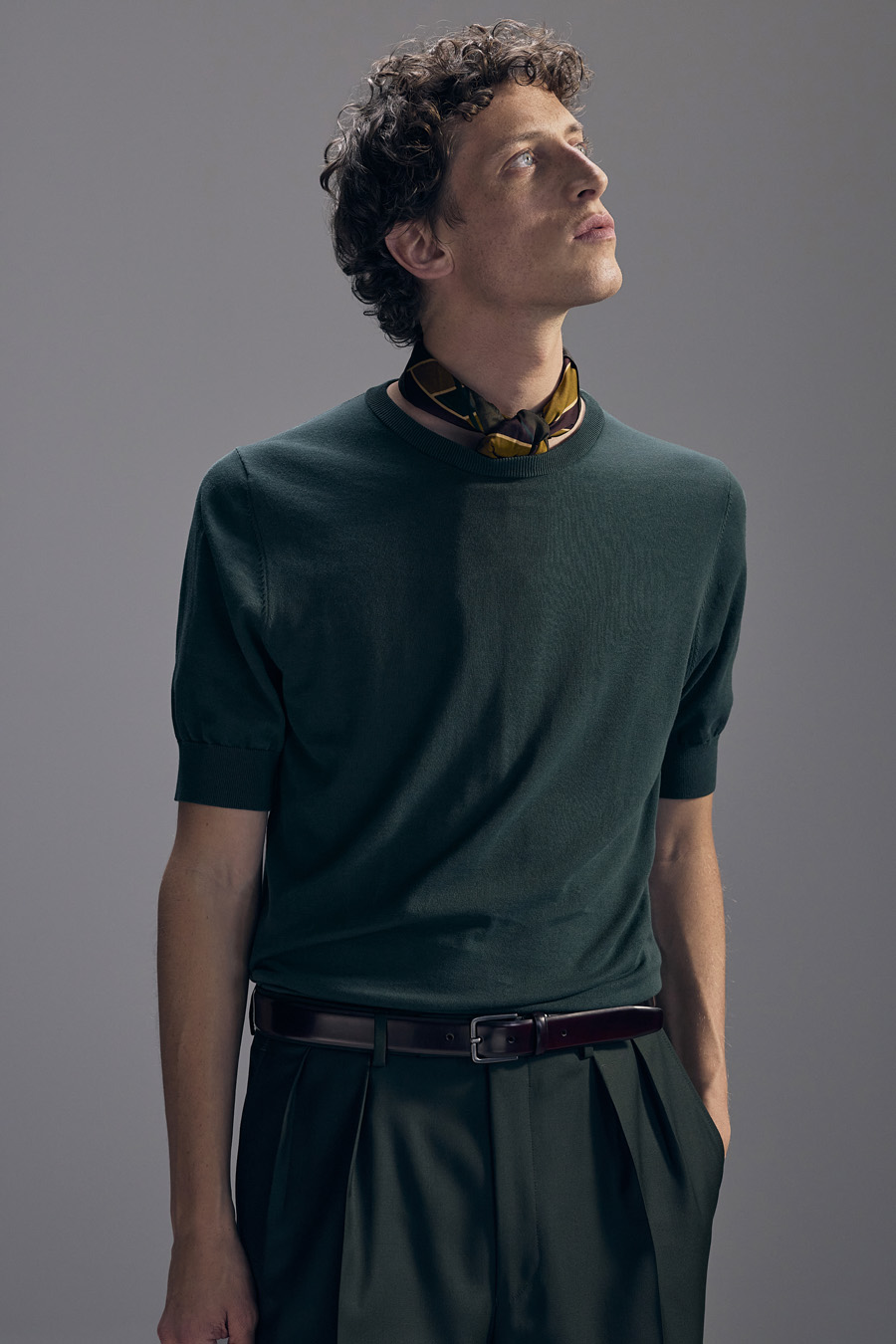 Crafted from fine-gauge knitwear, it offers a soft, breathable texture and a slim, structured fit.