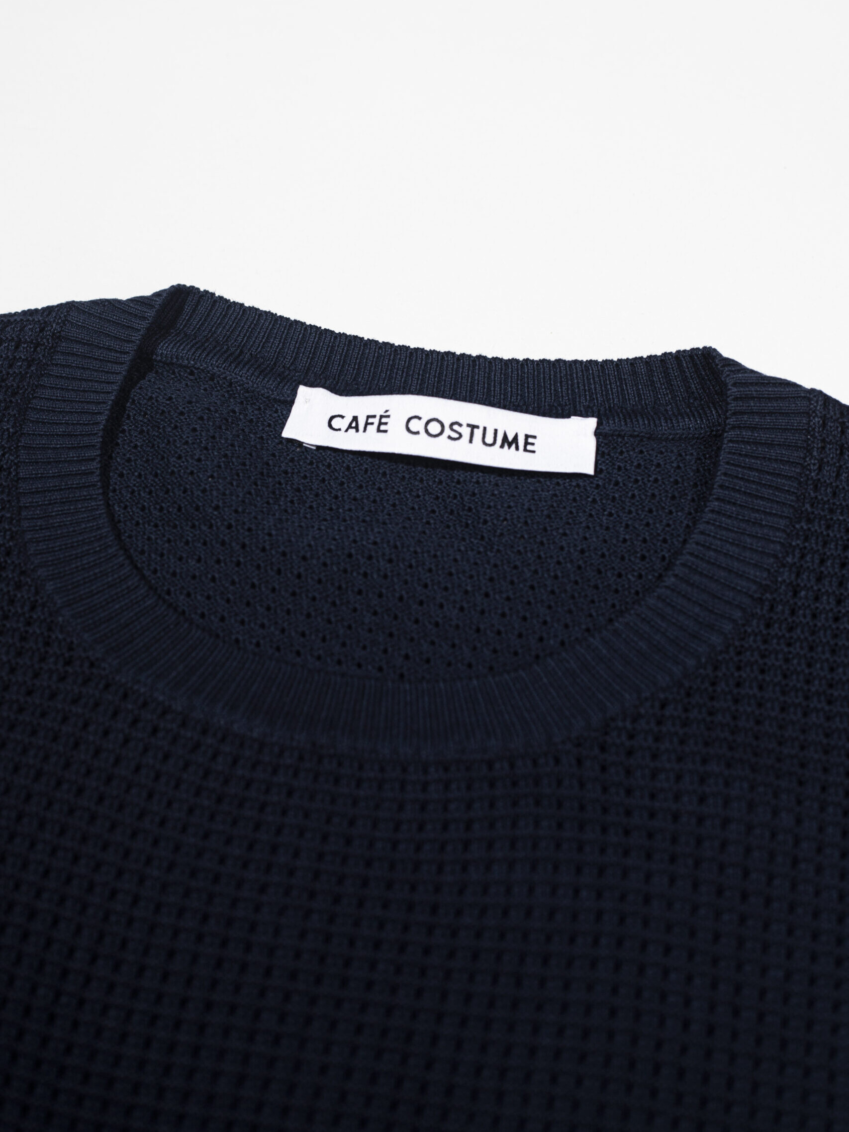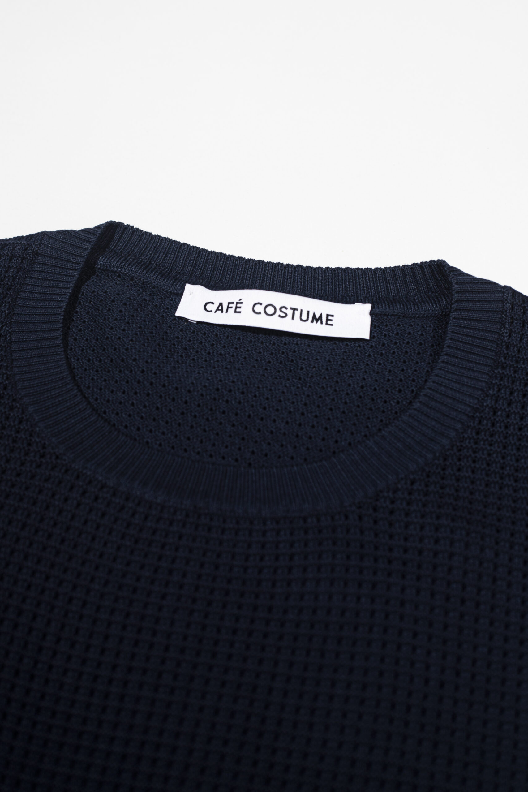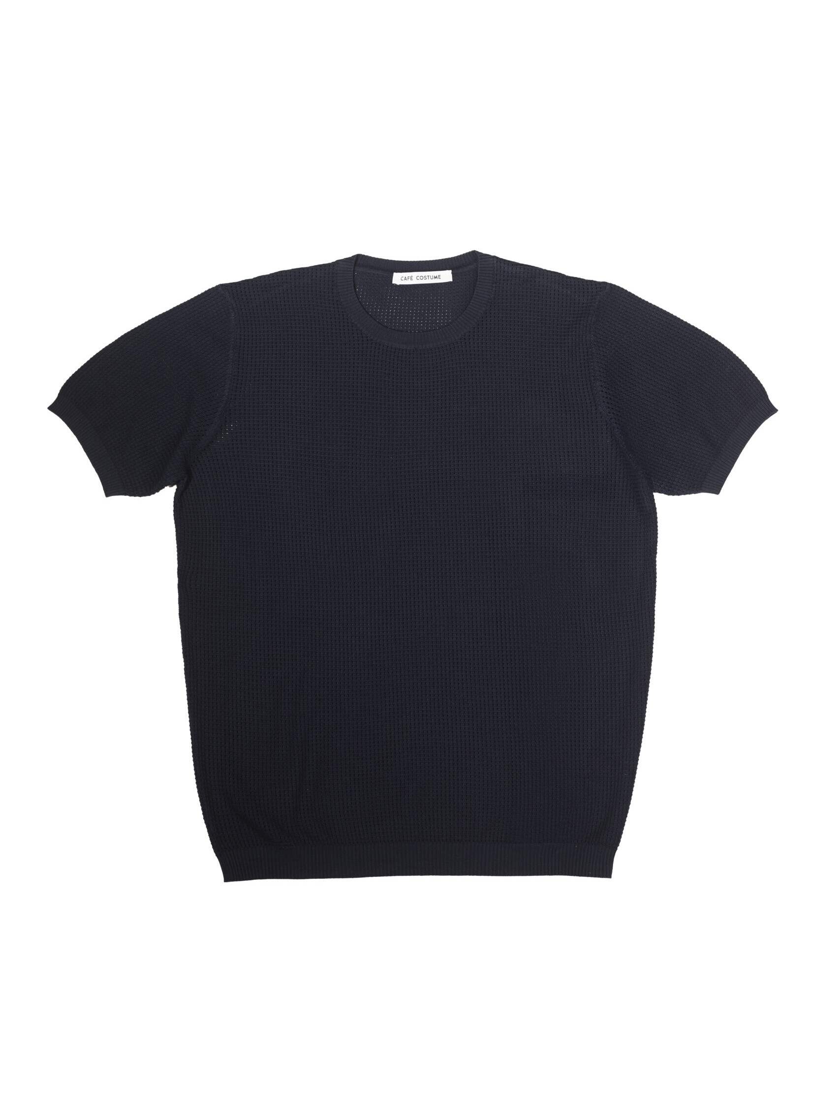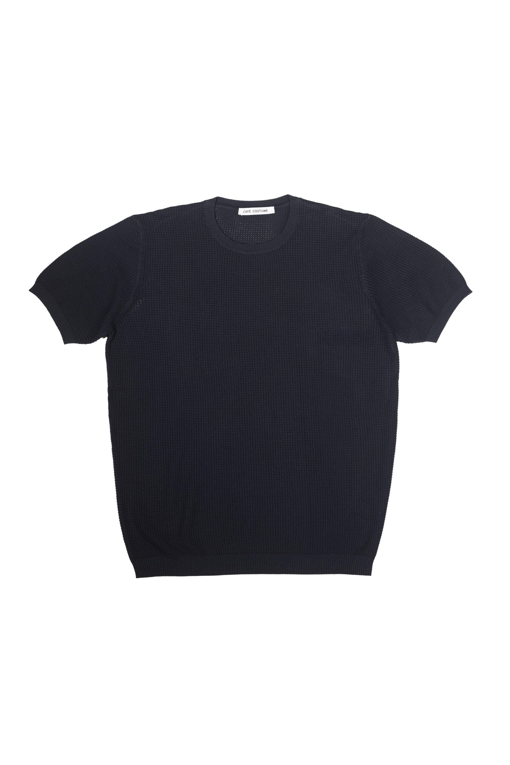 A breathable mesh-knit navy T-shirt with a lightweight structure and refined texture. Made in Italy for effortless summer layering.