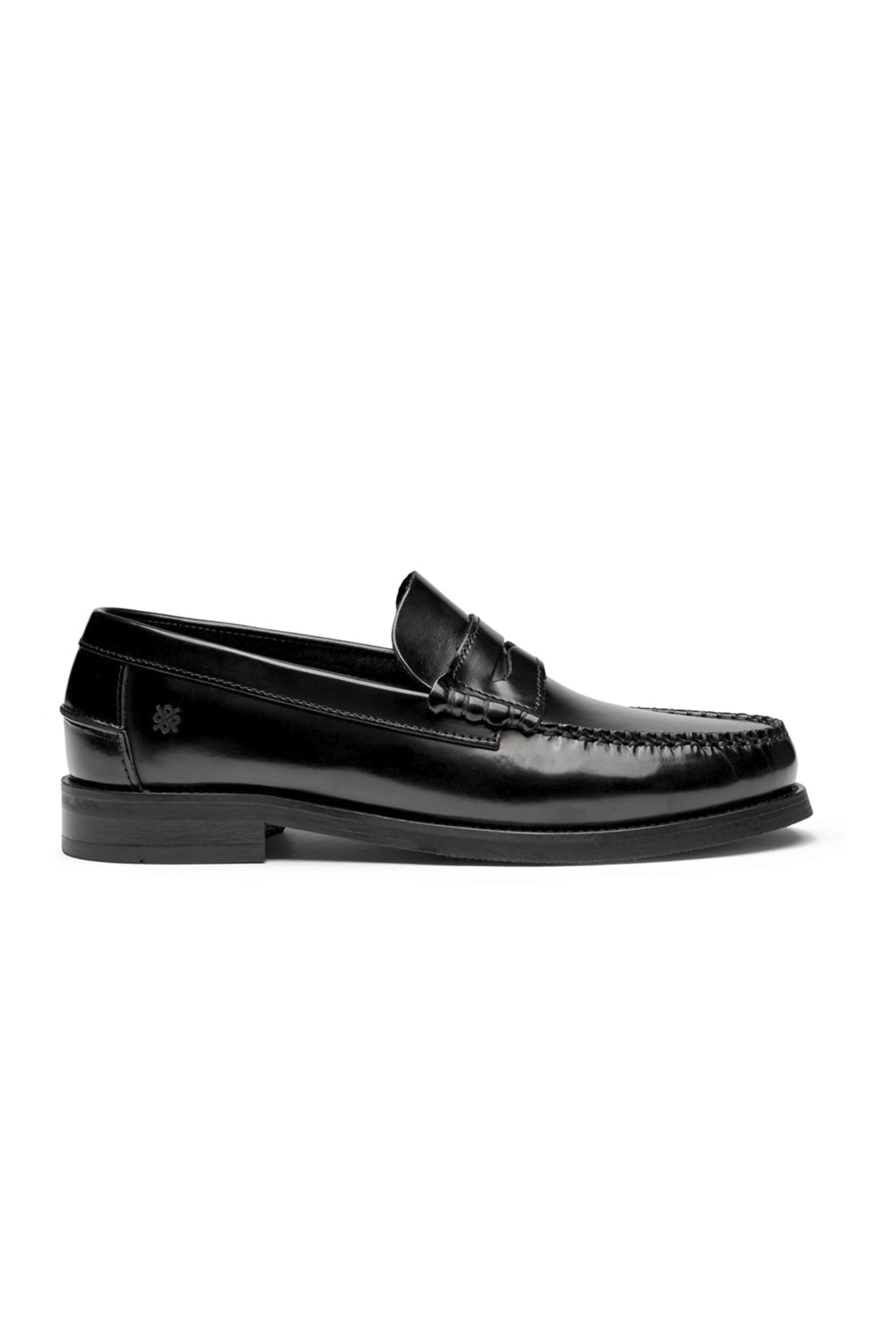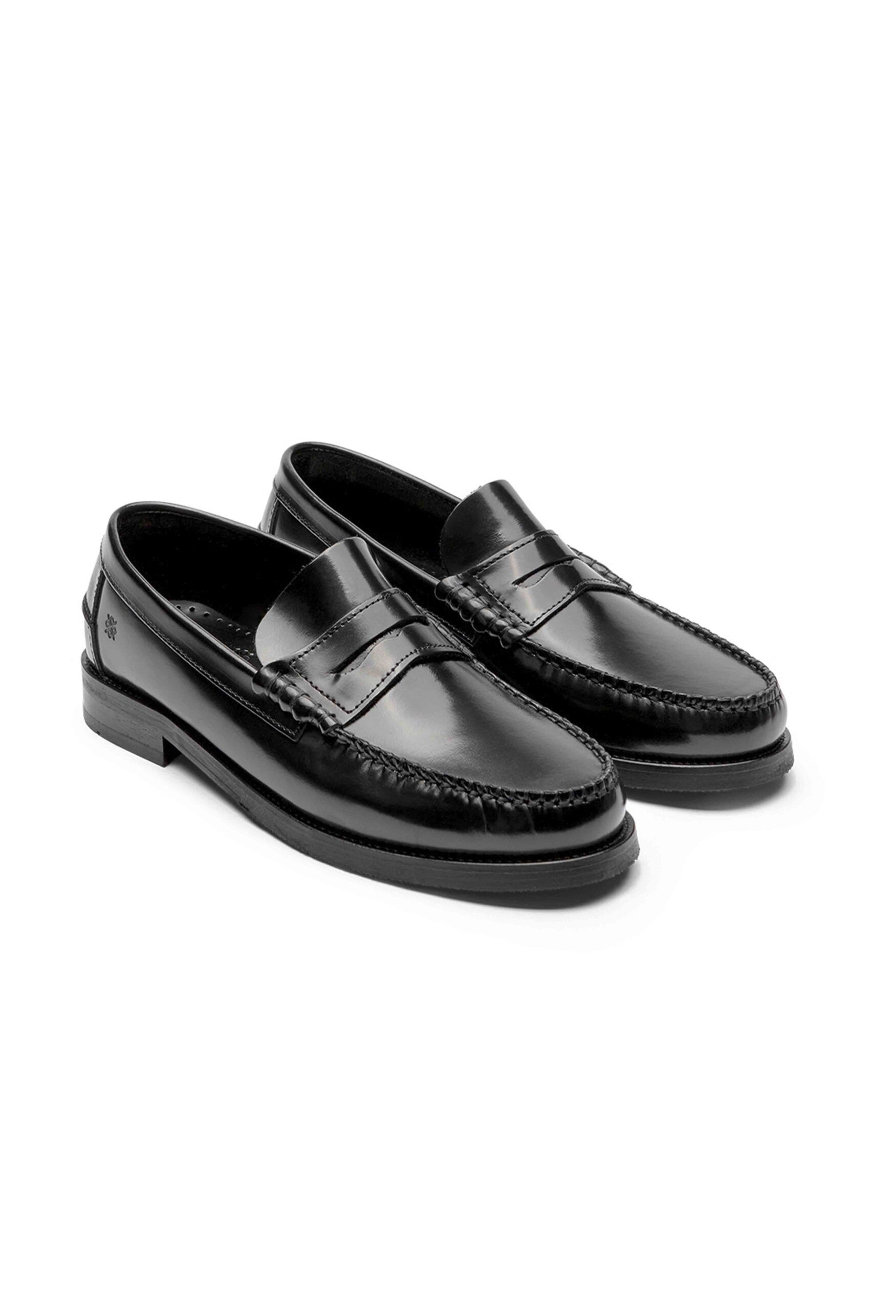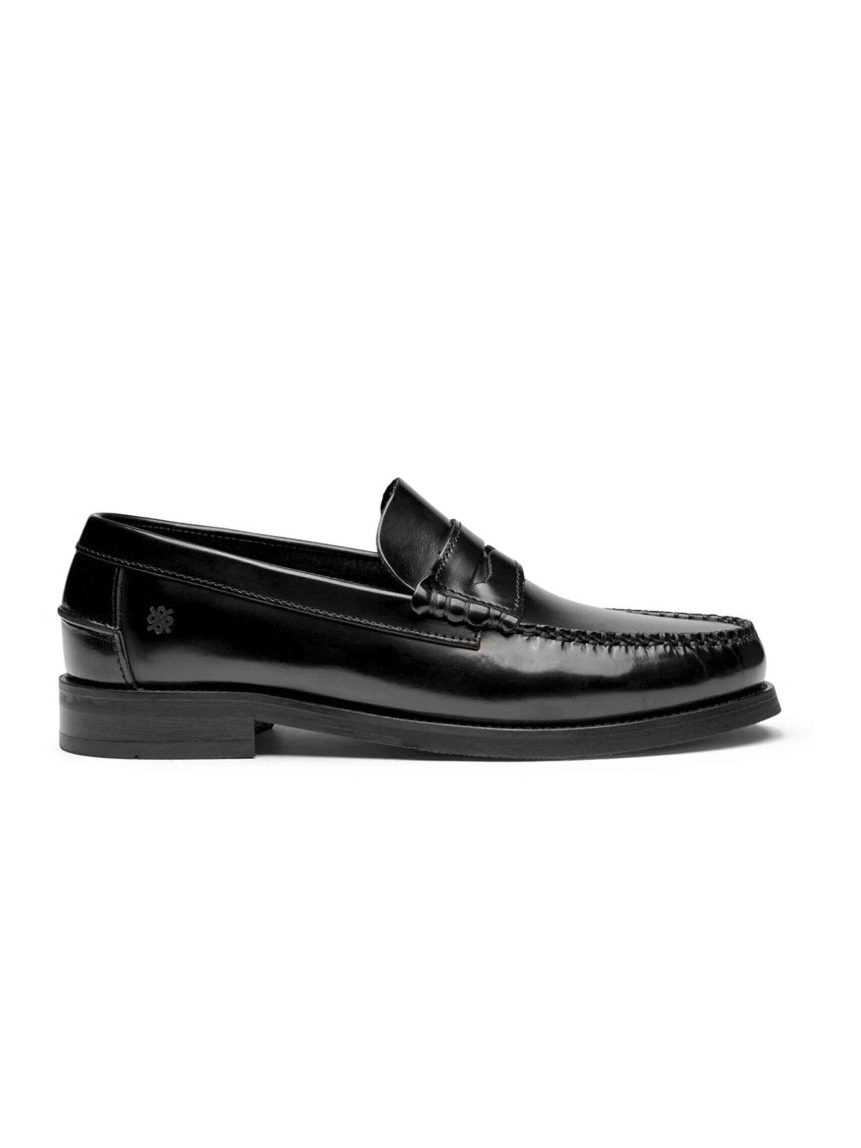 Penny loafer in polished polido leather on a classic, low rubber outsole. Hand-sewn with open, matching moccasin stitching, penny keeper detail and insole in polido leather.