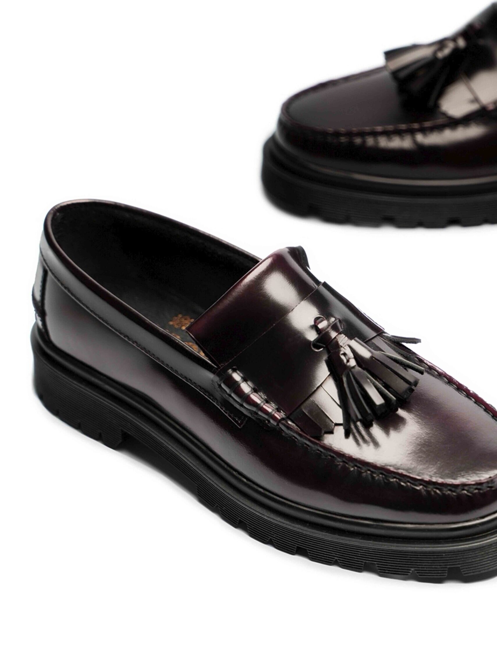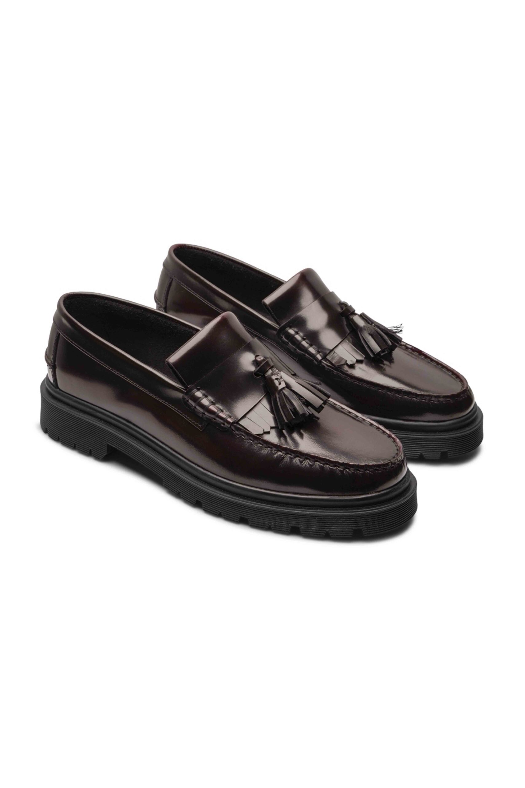 Fringe tassel loafer in polished polido leather on a cool, rugged rubber outsole. Hand-sewn with open, matching moccasin stitching. Micro lining and cushioned micro insole for extra comfort.