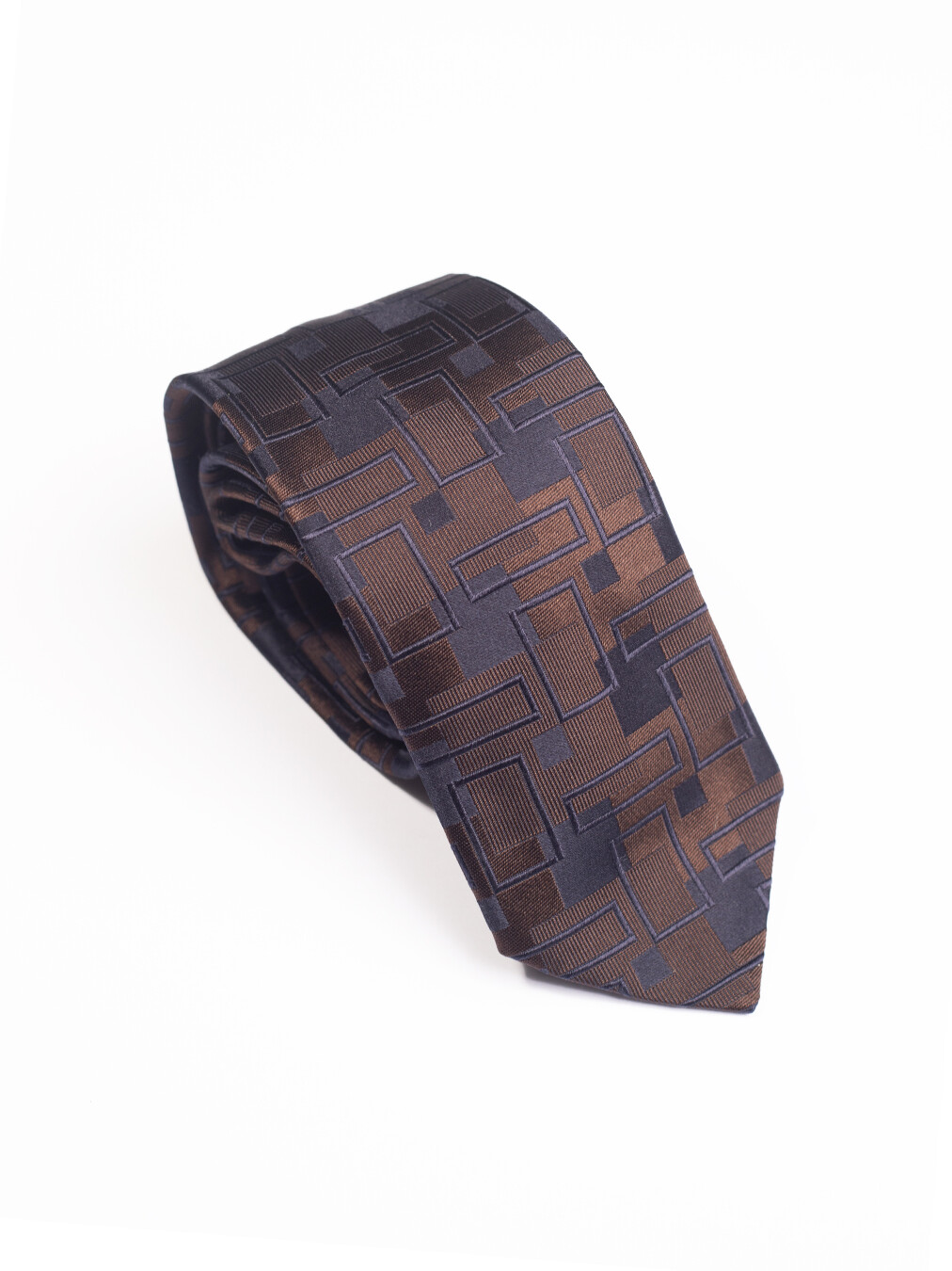 A sophisticated brown silk tie adorned with a modern geometric pattern. Its subtle interplay of light and shadow creates depth, making it a versatile choice for both formal and contemporary tailored looks.
